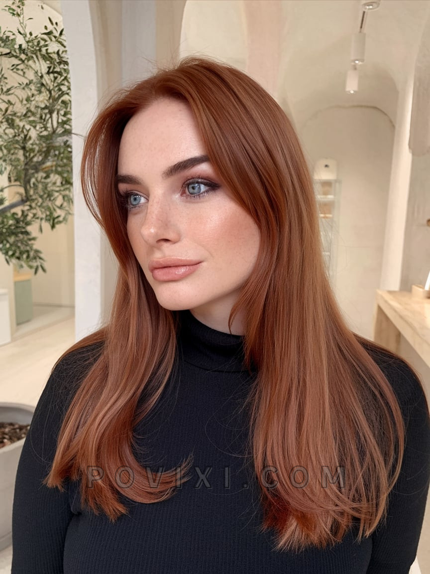 Minimalism meets warmth in this sleek medium length style with a captivating coppery brunette hue. The straightened strands emphasize the silky texture and soft layering near the ends. This look doesn’t rely on complex coloring; instead, it celebrates the purity of color with a modern, polished vibe. Ideal for short hair lovers growing out their style or seeking a low-maintenance summer upgrade.