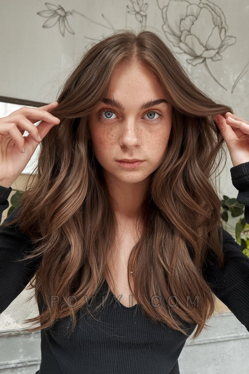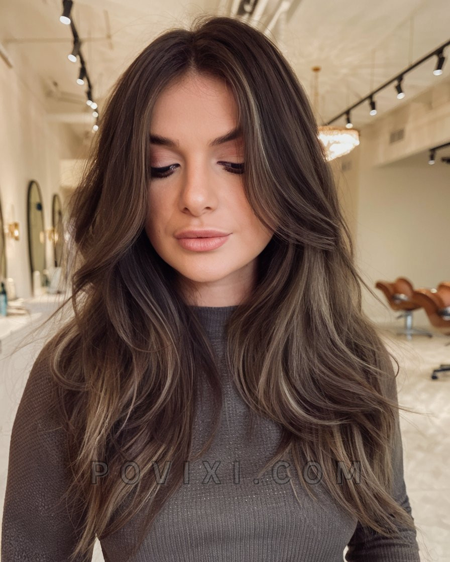 For those who prefer their brunette on the cool side, this look is a masterpiece of tonal blending. The loose waves emphasize the ash undertones while adding dimension and a sense of playful texture. The color pattern combines both lowlights and muted highlights, perfect for anyone wanting to refresh their long hair without diving into heavy maintenance.