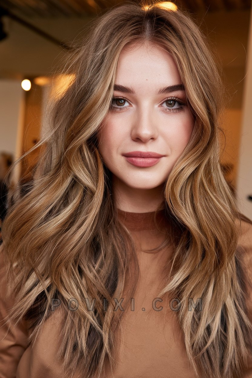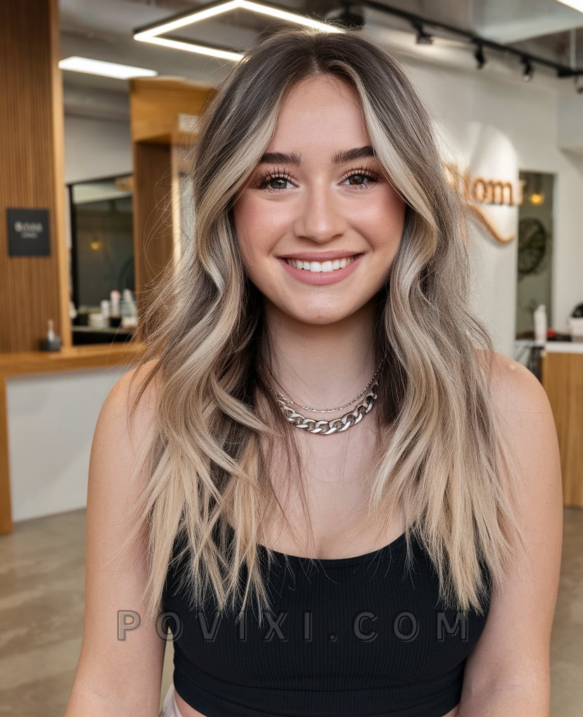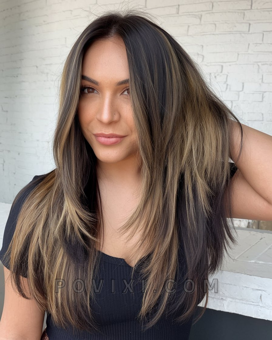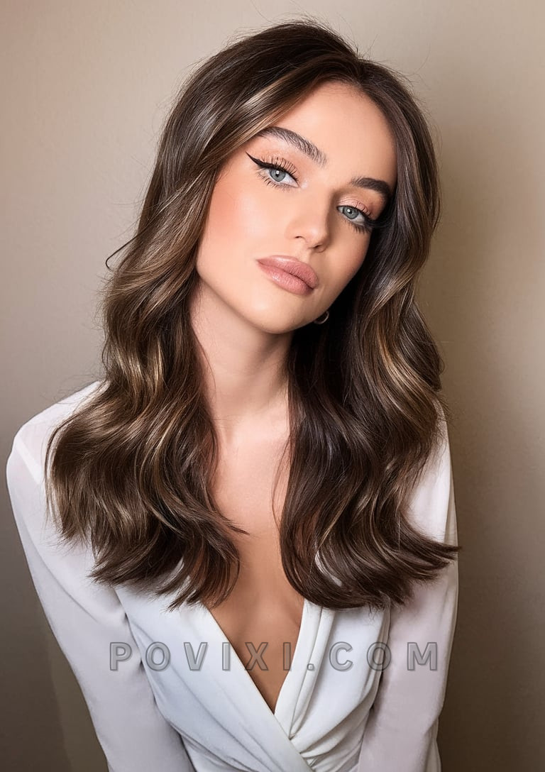 This long hairstyle combines dimensional highlights in cool ash and sandy blonde tones that are perfectly blended into the natural dark brown base. Ideal for tan skin, the soft waves give the hair added volume and movement. The combination is great for women who want a timeless and elevated 2025 look that’s neither too warm nor too bright. A middle or side part will keep it versatile, making it suitable for both work and weekends.