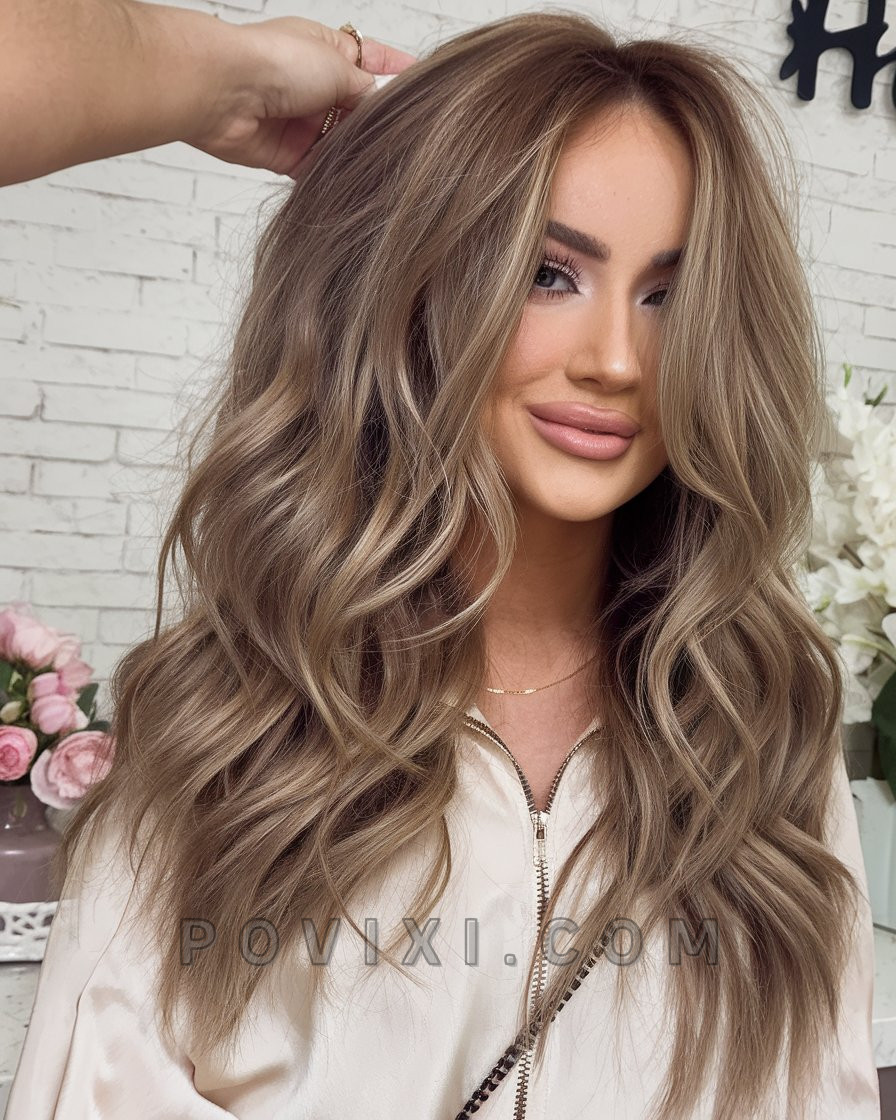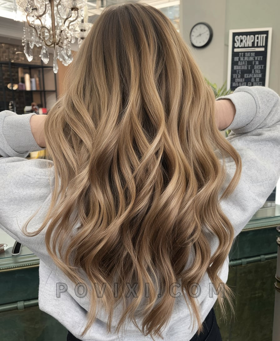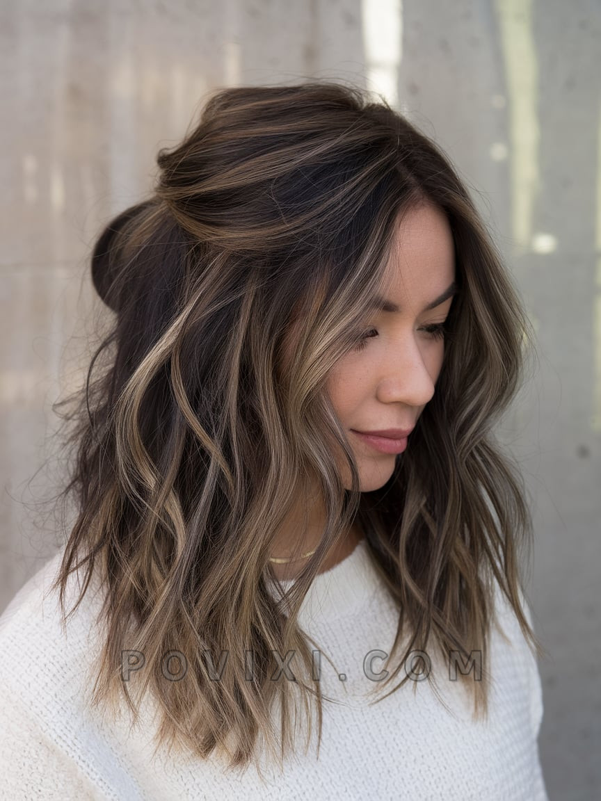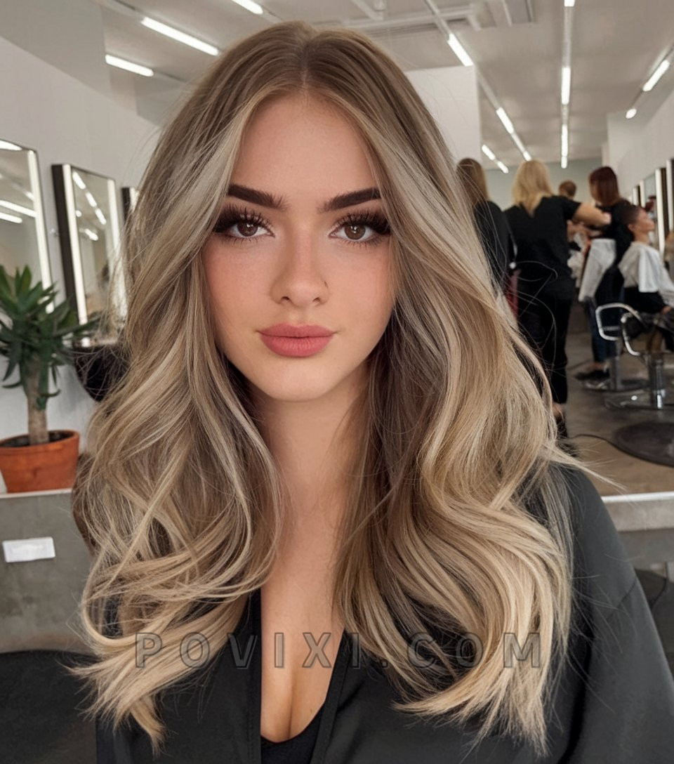 This long hairstyle combines dimensional highlights in cool ash and sandy blonde tones that are perfectly blended into the natural dark brown base. Ideal for tan skin, the soft waves give the hair added volume and movement. The combination is great for women who want a timeless and elevated 2025 look that’s neither too warm nor too bright. A middle or side part will keep it versatile, making it suitable for both work and weekends.