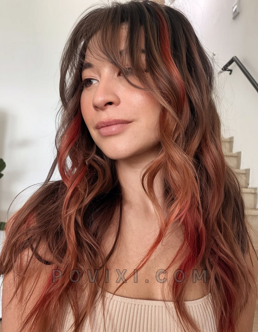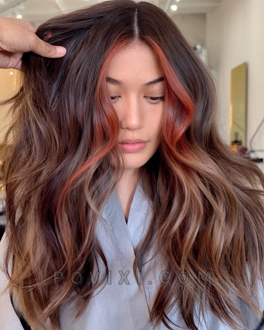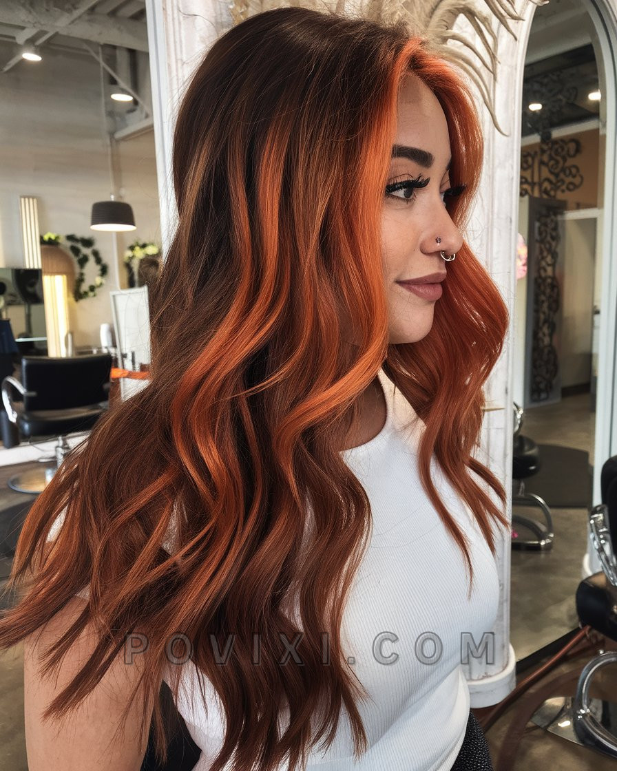 For those who want a bolder pop without committing to full-on red, this look weaves in warm cinnamon highlights into rich, dark waves. The dimension here is stunning on long hair and enhances texture naturally, especially for women who love curly finishes. It’s playful yet refined—a must-try for anyone craving change but sticking to warm tones.