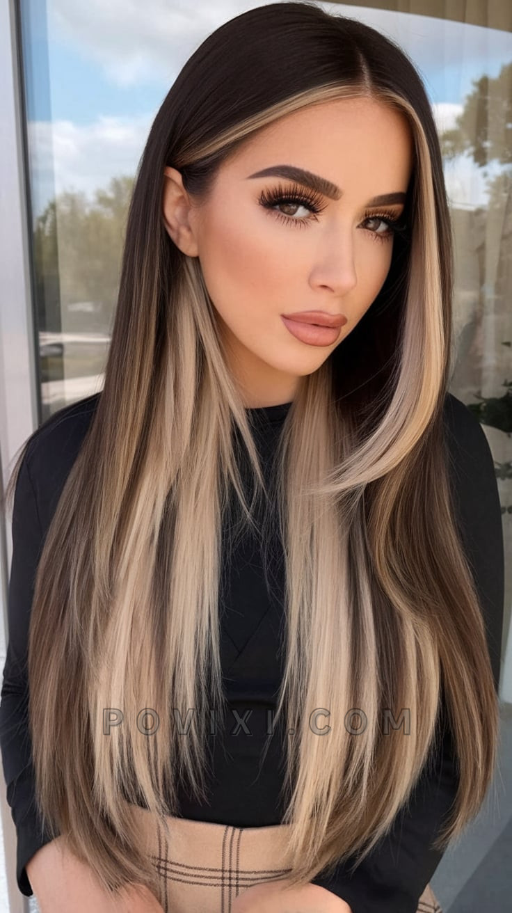 Taking a cue from high-contrast trends, this look features bold blonde framing on sleek straight locks. The deep dark base grounds the dramatic light strands, creating a runway-ready aesthetic. Best worn long and ultra-polished, this color technique is ideal for brunettes looking to break from the norm and embrace high fashion this 2025.