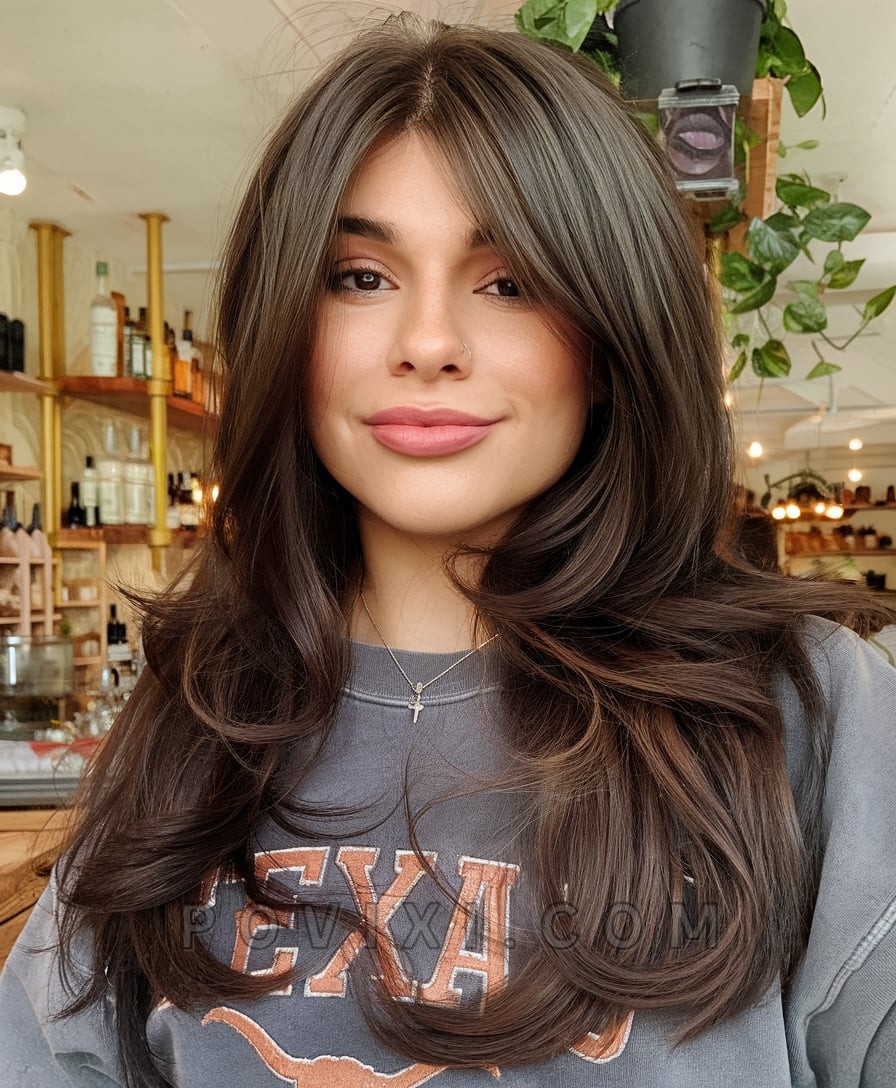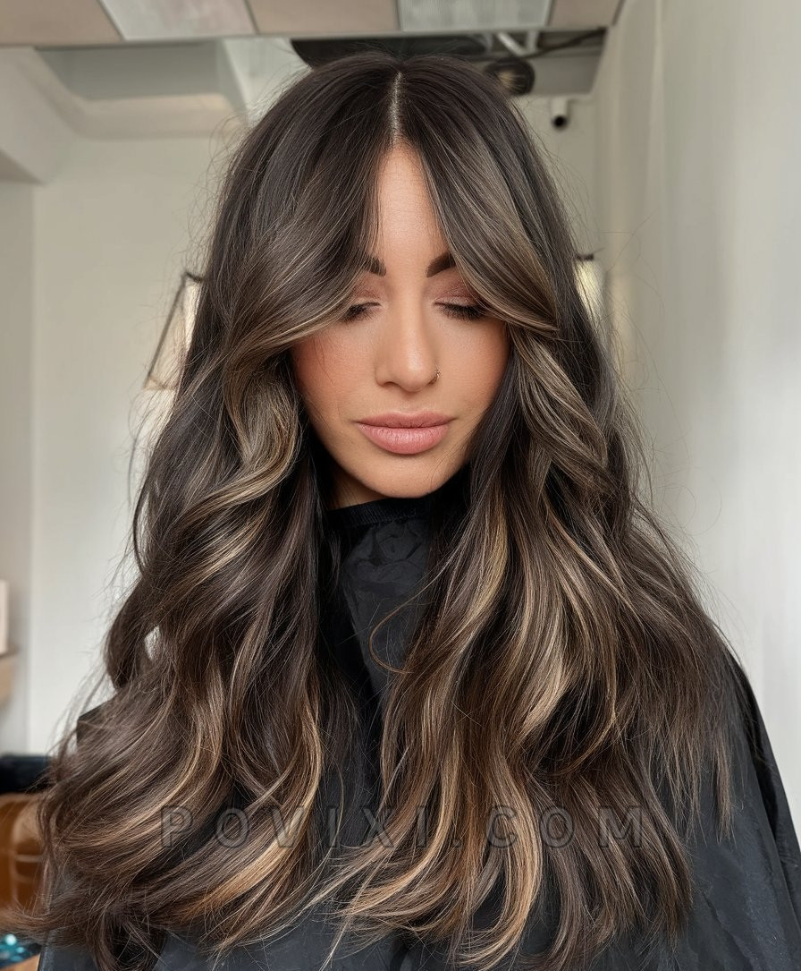 This one’s for the minimalist. The dark brown base is enriched with cool-toned highlights in mocha and ash, giving just enough depth to catch the light. With softly defined waves and a middle part, this long hair style is ideal for women who want low-maintenance polish with just the right amount of glow. Great for the office or weekend markets.