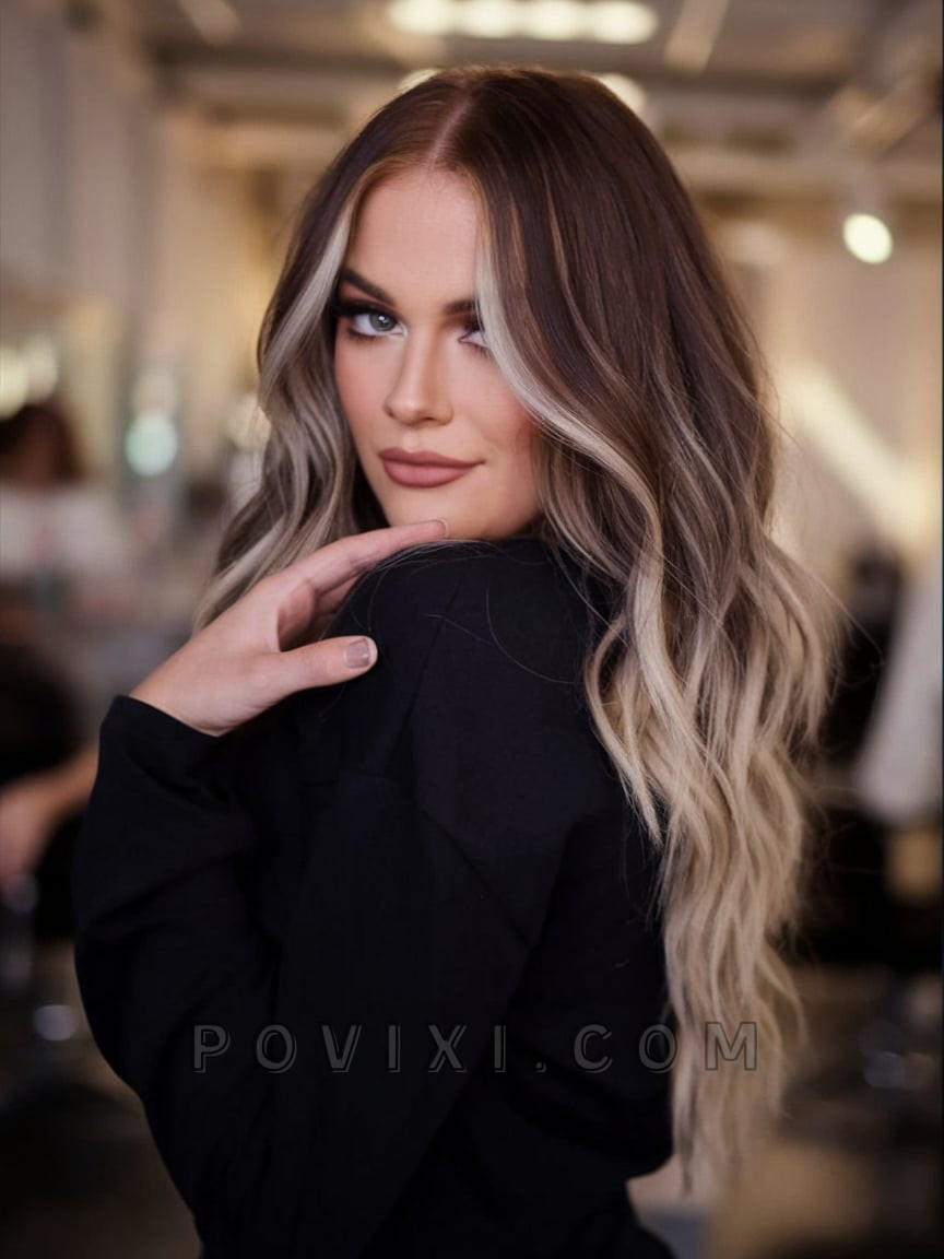 Perfect for the trend-conscious brunette, this look blends cool blonde tones into soft ash brown for a high-fashion feel. Styled in large barrel waves, it’s the perfect balance between red carpet glamour and everyday wear. This long hairstyle works best on women who love high-impact color with low-maintenance roots.