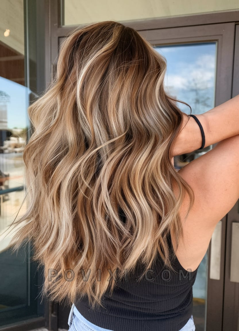 If you’re aiming for fun and flirty, this look brings the sunshine. The cascading balayage transitions from dark chocolate brown to luscious honey and blonde strands, mimicking that natural summer glow. These radiant tones are ideal for medium length or long hair, especially when worn in loose, voluminous waves. Pair it with denim and a black tank for an effortlessly cool vibe.