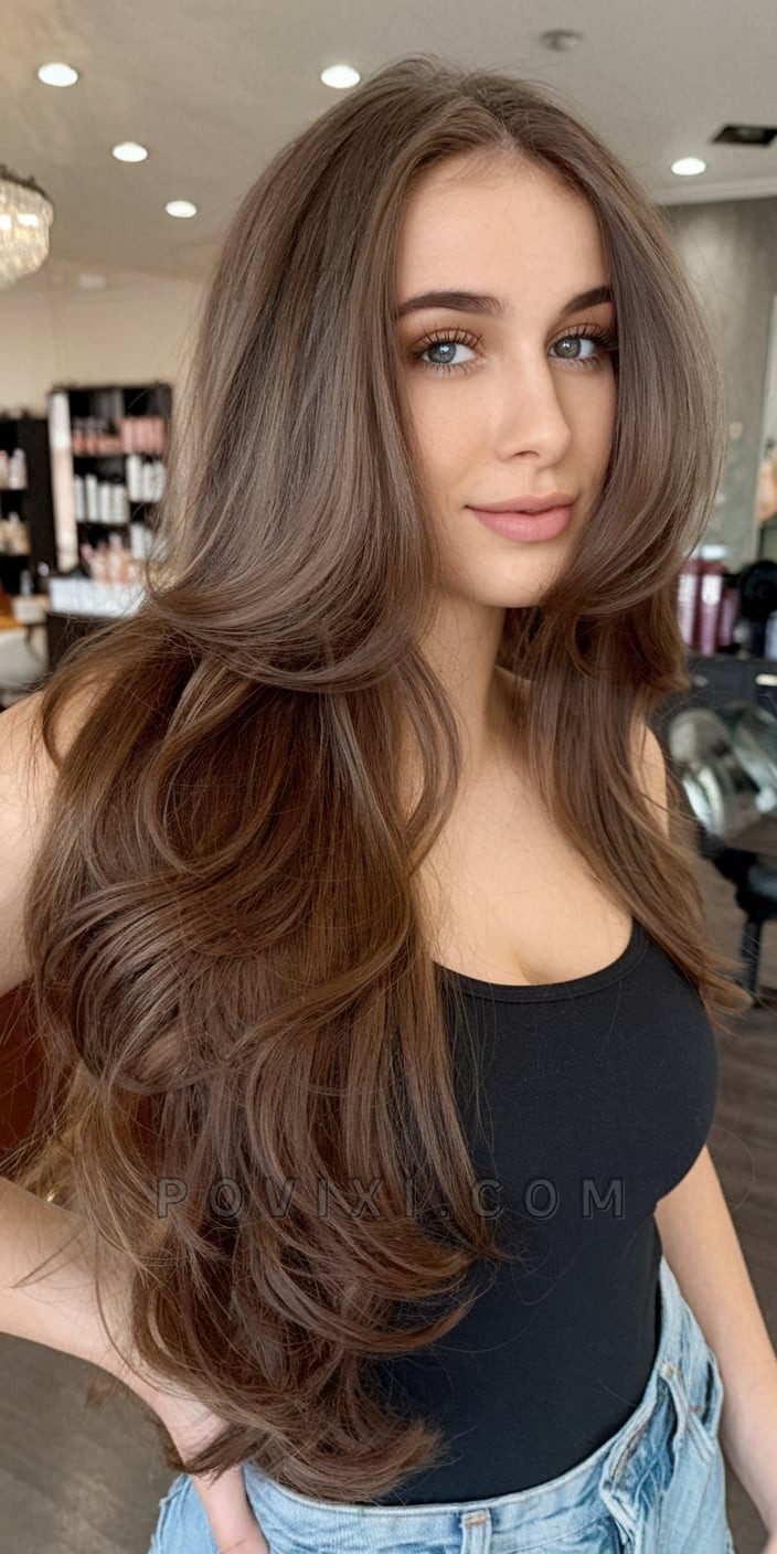 This long, voluminous brunette style is a masterclass in timeless beauty. The soft layers frame the face effortlessly, while the subtle balayage adds a gentle lift and dimension without overpowering the natural dark brown base. Perfect for women who want something low-maintenance yet striking, this look pairs beautifully with neutral summer outfits—think black tank tops and denim. Ask your colorist for Highlights focused on the mid-lengths and ends to keep the root area rich and natural. Use a round brush to create this signature bounce.