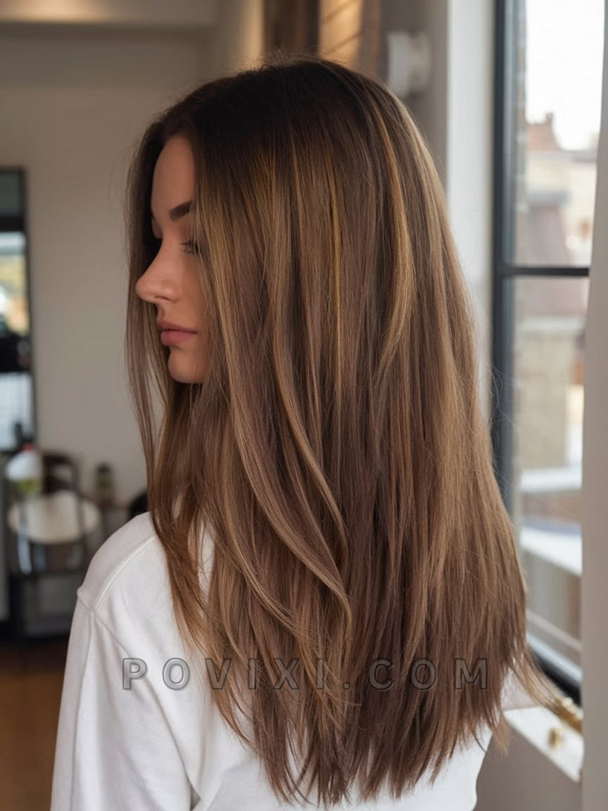 If you’re not quite ready for bold color, this long and slightly layered cut adds just a touch of sun-kissed vibrancy while keeping things natural. Ideal for straight or softly waved styles, it’s a great option for women who want that “better than natural” finish. A lightweight serum or gloss spray will amplify the healthy shine.