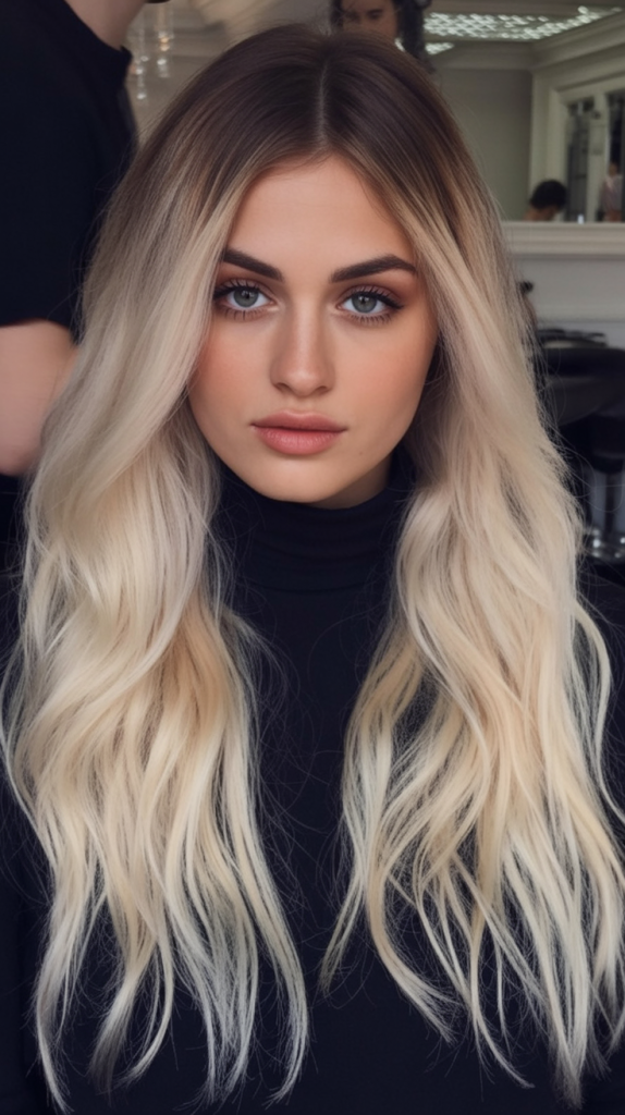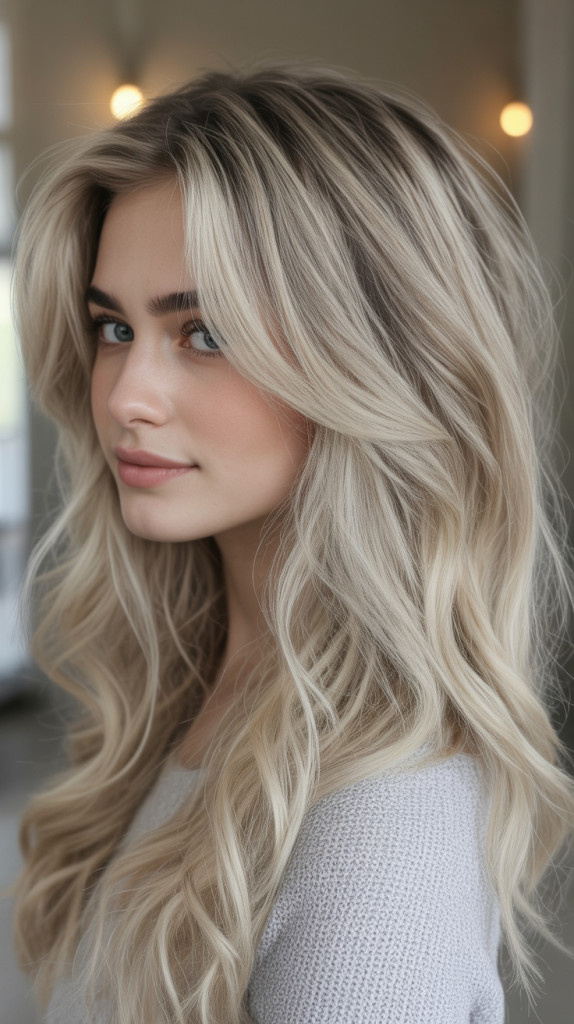 The cool blonde color with dark roots is the ideal winter fashion. The contrast has an edge to it, yet the long slightly undone texture makes it casual and wearable. The entire appearance suggests relaxed confidence, such as a well-worn knit sweater coupled with fresh air and softer light on a cold afternoon.