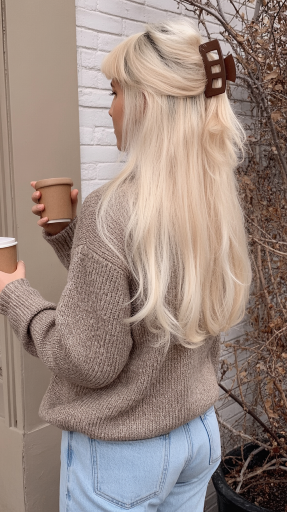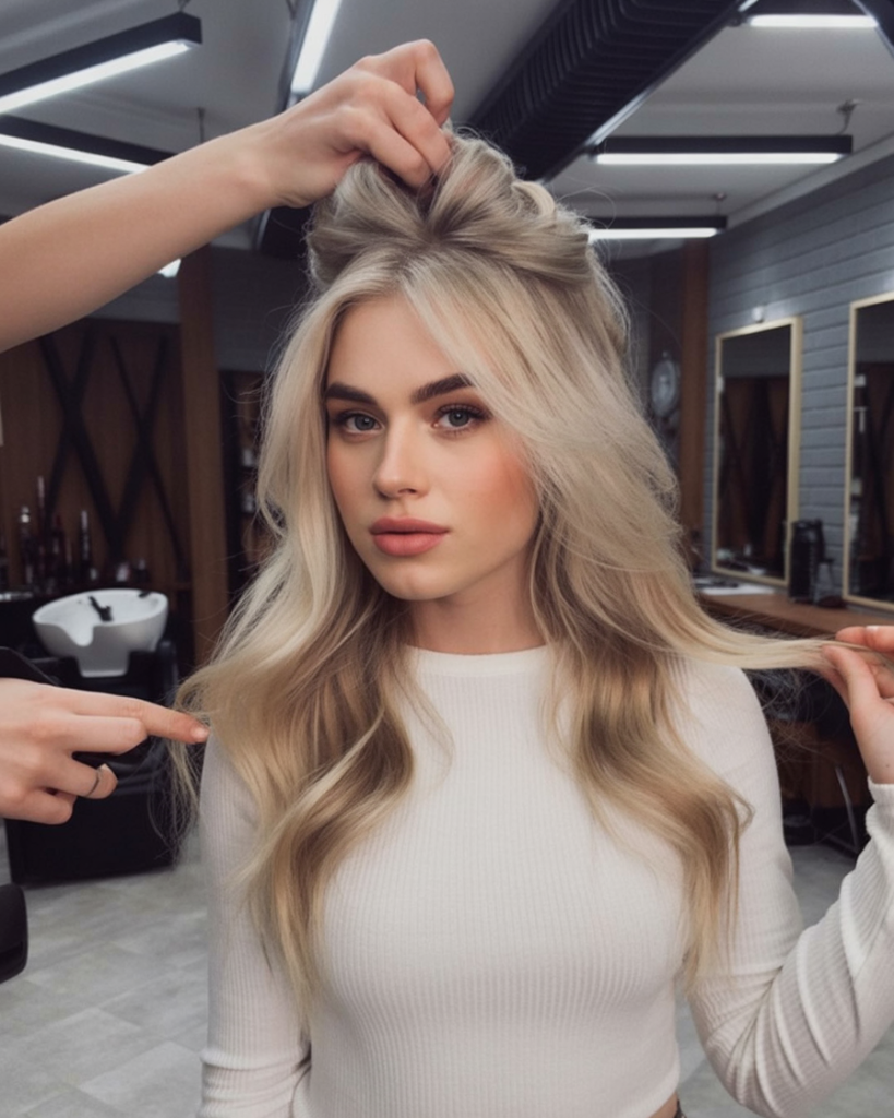 There’s something young and fresh about a voluminous half-up winter blonde. The brightness of the blonde looks great with the extra height at the crown, giving your look immediate lift. It’s feminine, chic and perfect for casual days and romantic evenings.