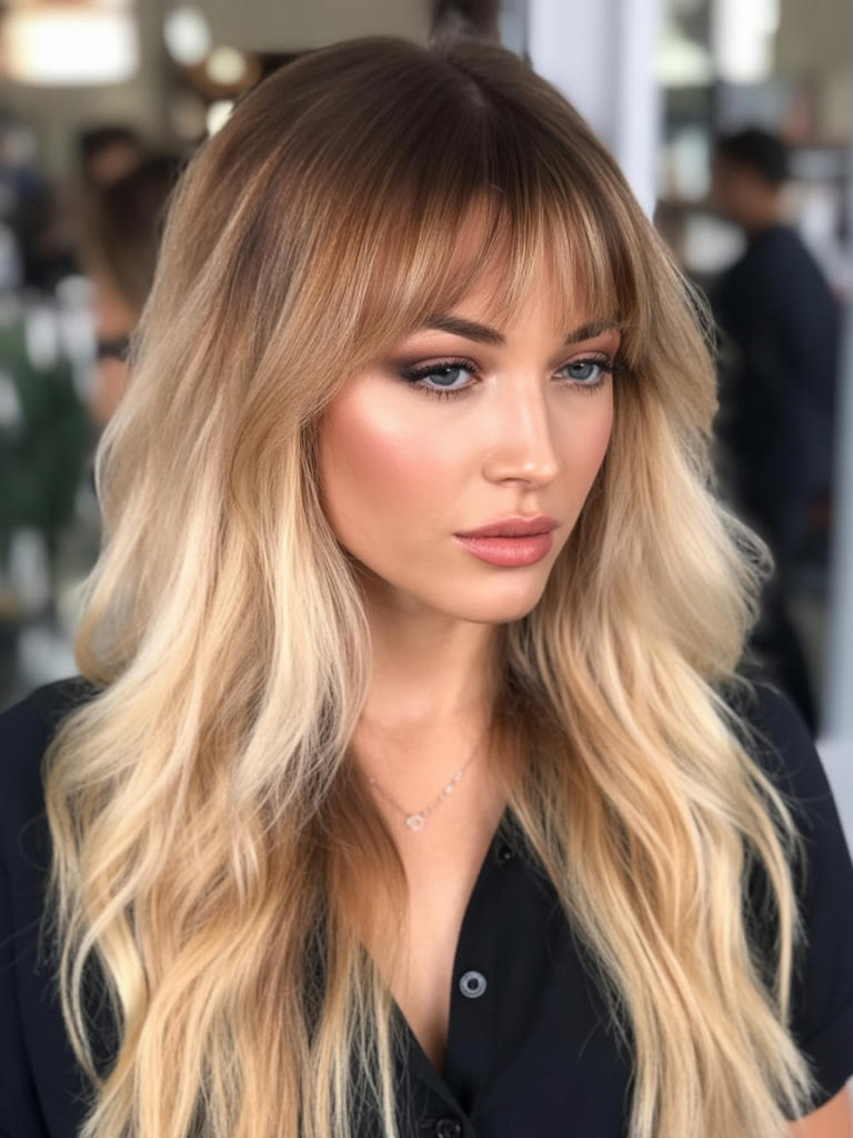 This balayage blonde with long cut wispy bangs is romantic, but bold, with softness on the sides of the eyes, and long flowing hair. The slight color variation between dark roots and bright tips creates a glow of the entire appearance in winter light. It is a hair style that is fun and contemporary and still retains an eternal appeal.