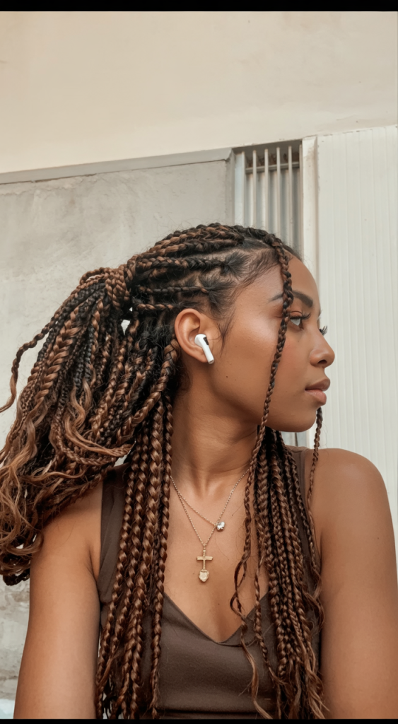 1. Half-Up Knotless Braids with Warm Tones