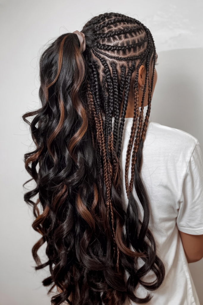 This hairstyle is a charming mix of the sleek precision of cornrows and the soft romance of wavy extensions tied up to the top of the head in a high ponytail. It’s the kind of style that says confidence and playfulness, ideal for winter when you want something useful but also eye-catching. The gentle undertones of color in the waves add even more dynamism.