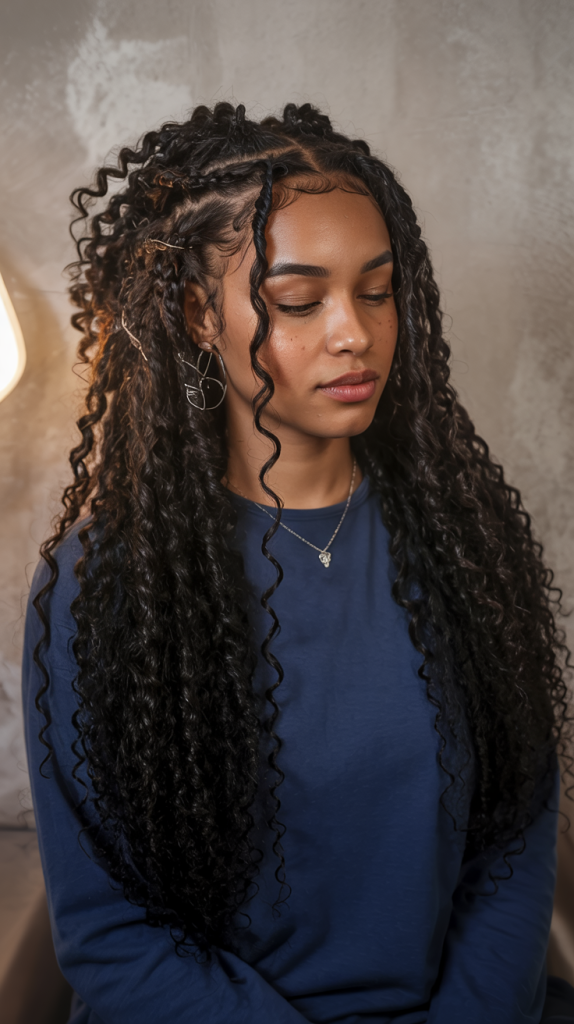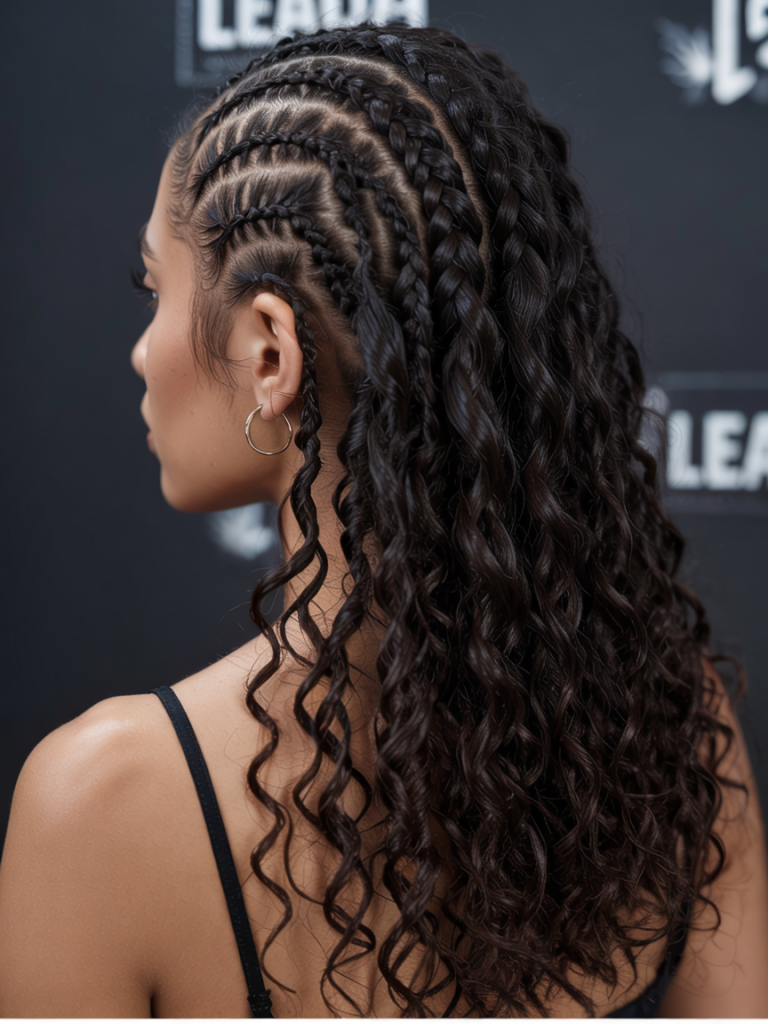 This is a good choice for black women who love to wear hair that works well for different styles. The cornrows maintain the neat and protective appearance, whereas the curls offer you freedom and bounce. It suits medium hair density especially well and goes well with contrasting colors in your outfit, such as earthy tones or jewel tones in your clothes.