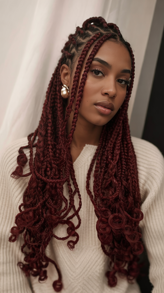 A show-stopper in winter, these burgundy braids with curled ends are bold and beautiful. The deep red creates warmth and richness, making your style stand out immediately among the comfort of sweaters and winter coats. The twisted tips add a playful and yet elegant touch to the overall look.