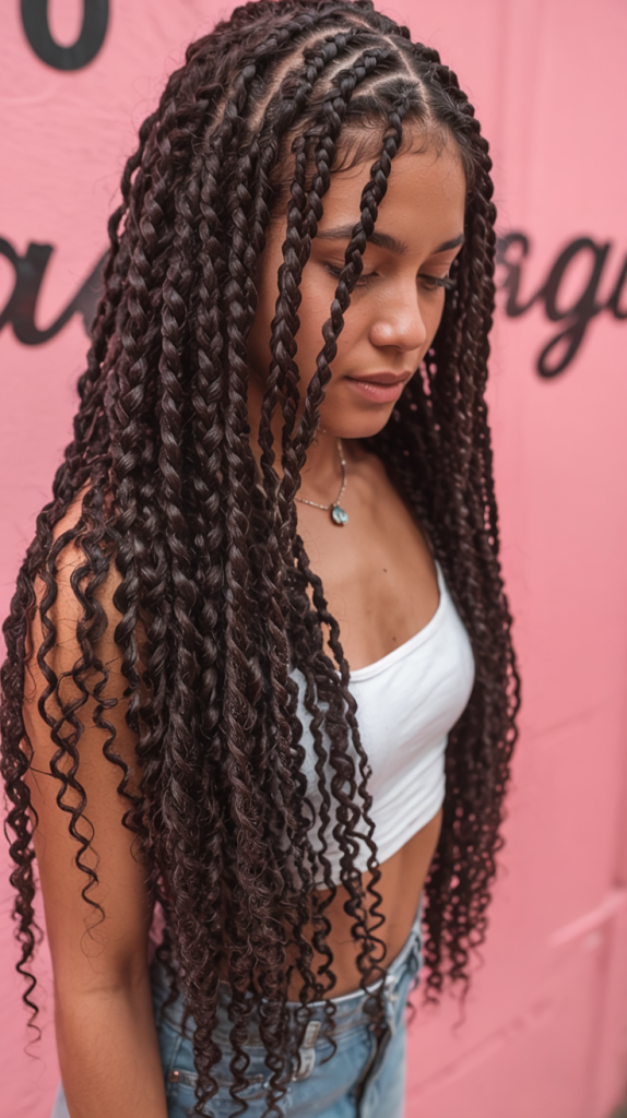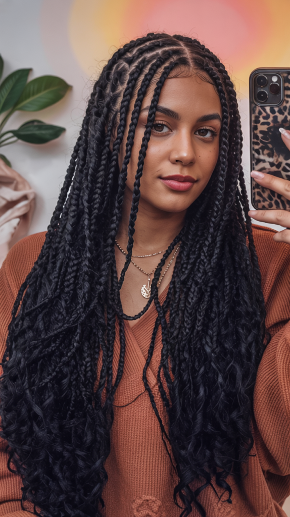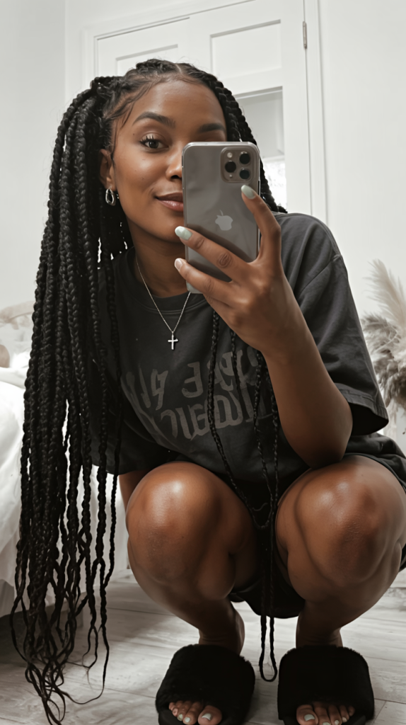 So there is nothing more striking than long waist-length box braids. They move in a graceful fashion and come with a confidence that makes any outfit look intentional and bold. The tightness of the braids adds to the appearance, making it neat and polished while still being versatile.
