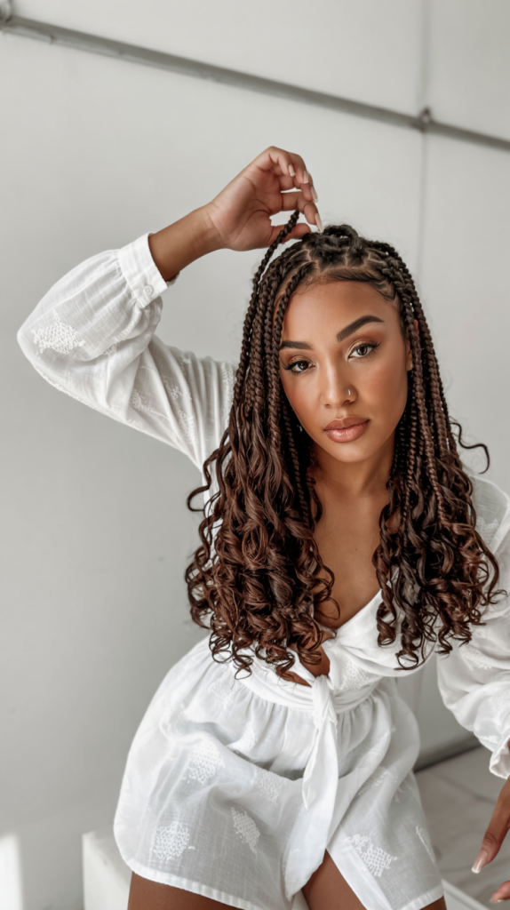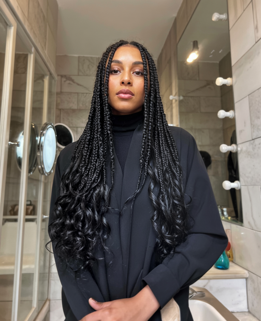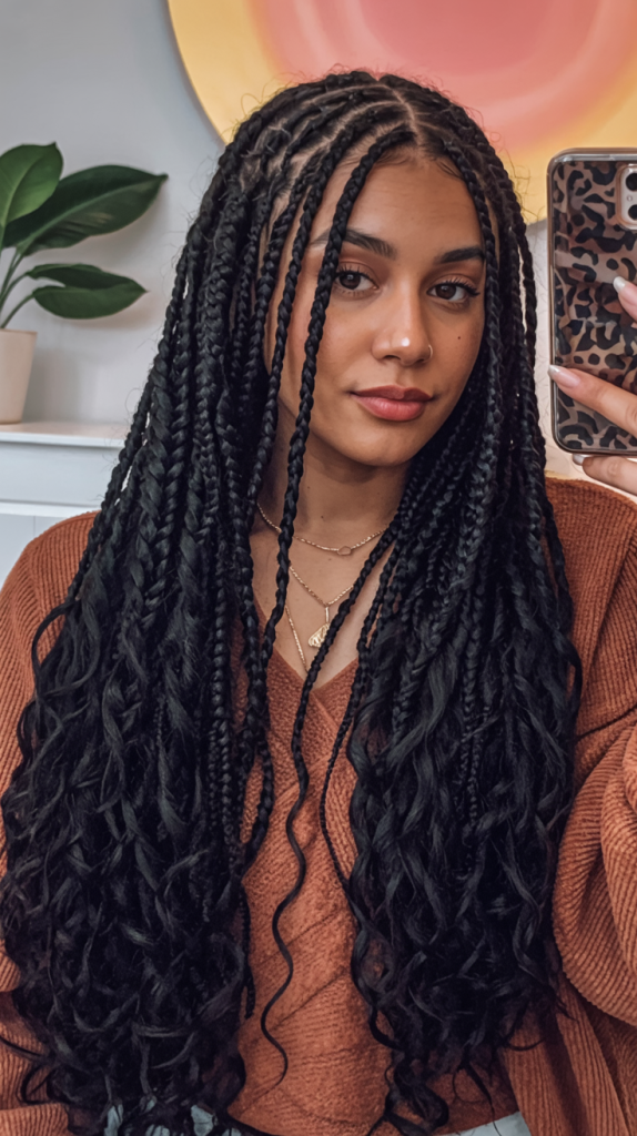 Medium box braids with curly ends are always a classic. They find the perfect balance between simplicity and elegance, and the curls bring a touch of softness that enhances the style. It’s a versatile look that can be worn anywhere, from the office to a date night.