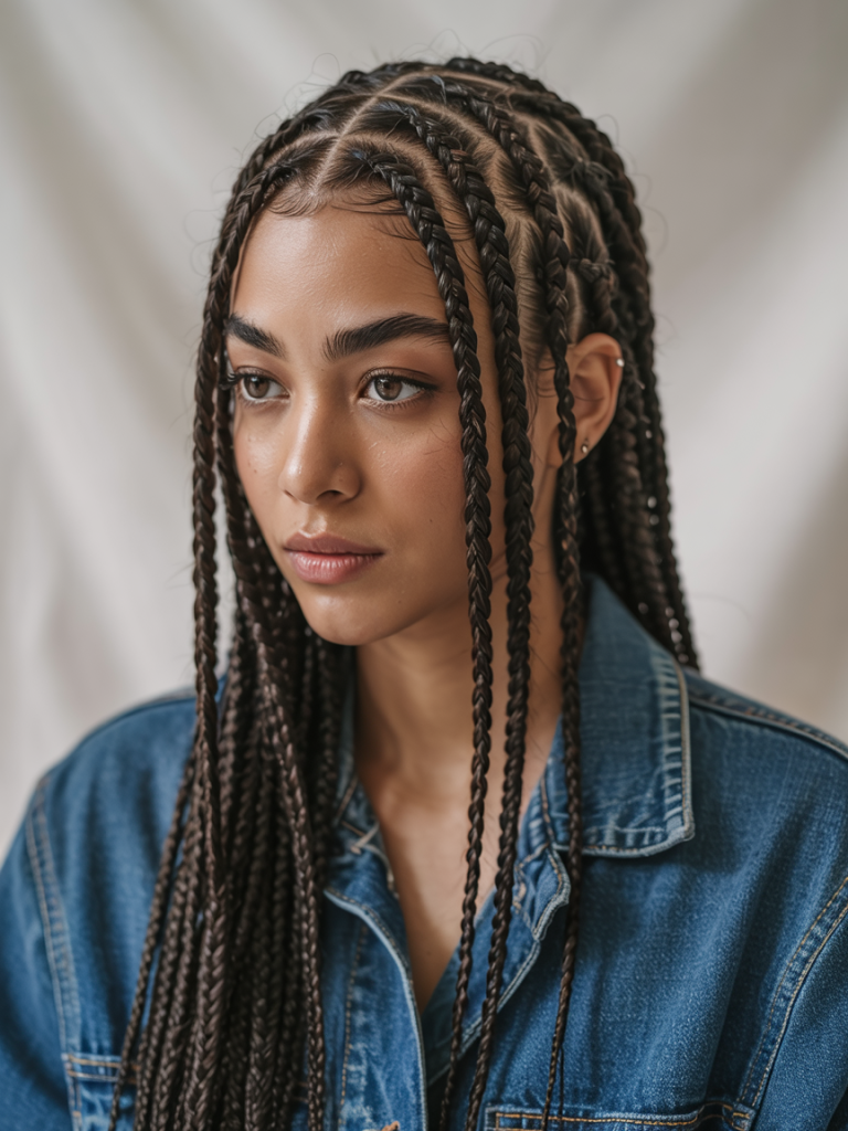 This style is ideal for black women who want a balance of chic precision with playful energy. The clean lines highlight the artistry of the braiding and the length allows you to get creative in your styling – from buns to ponytails. It is a very flattering option for medium hair density and works particularly well if you love to experiment with seasonal colours.