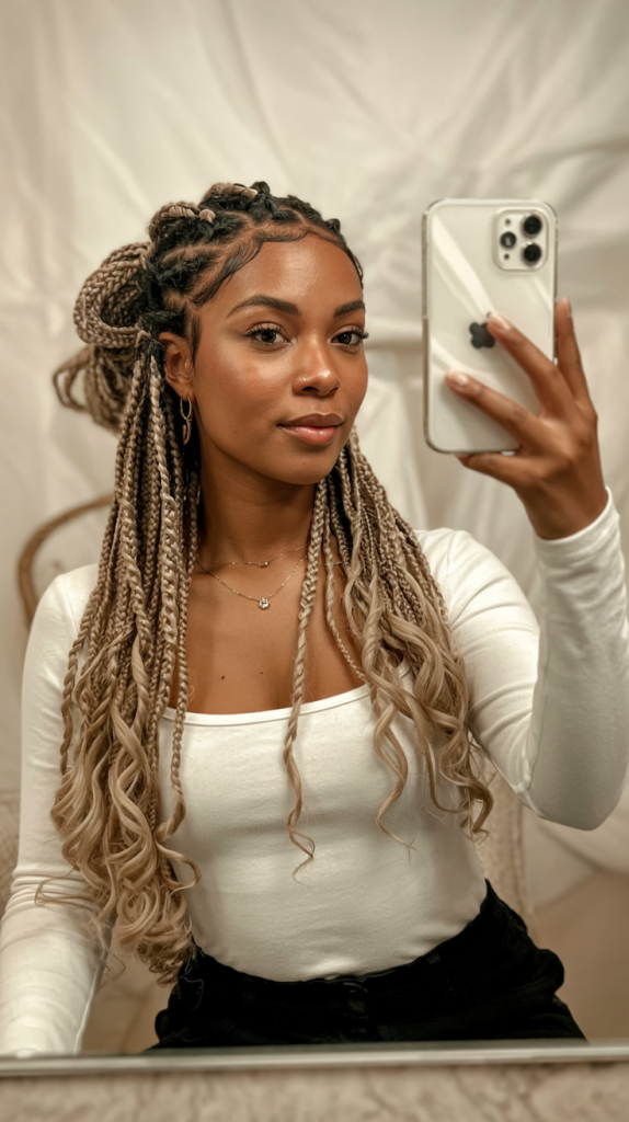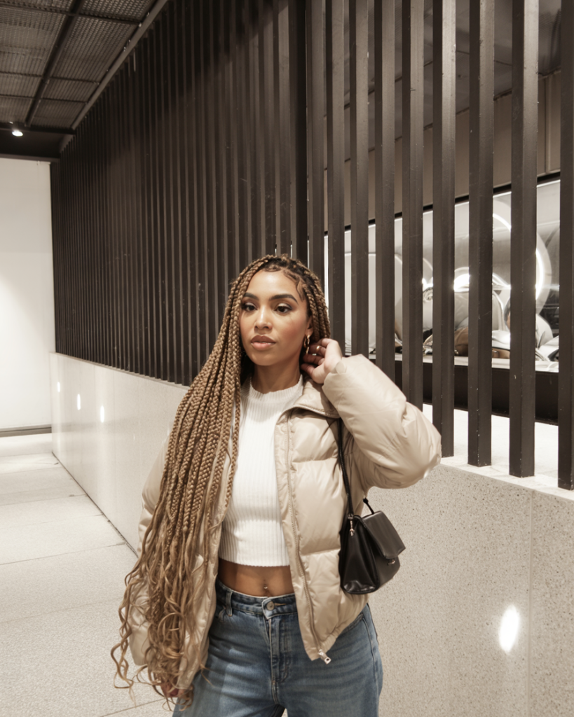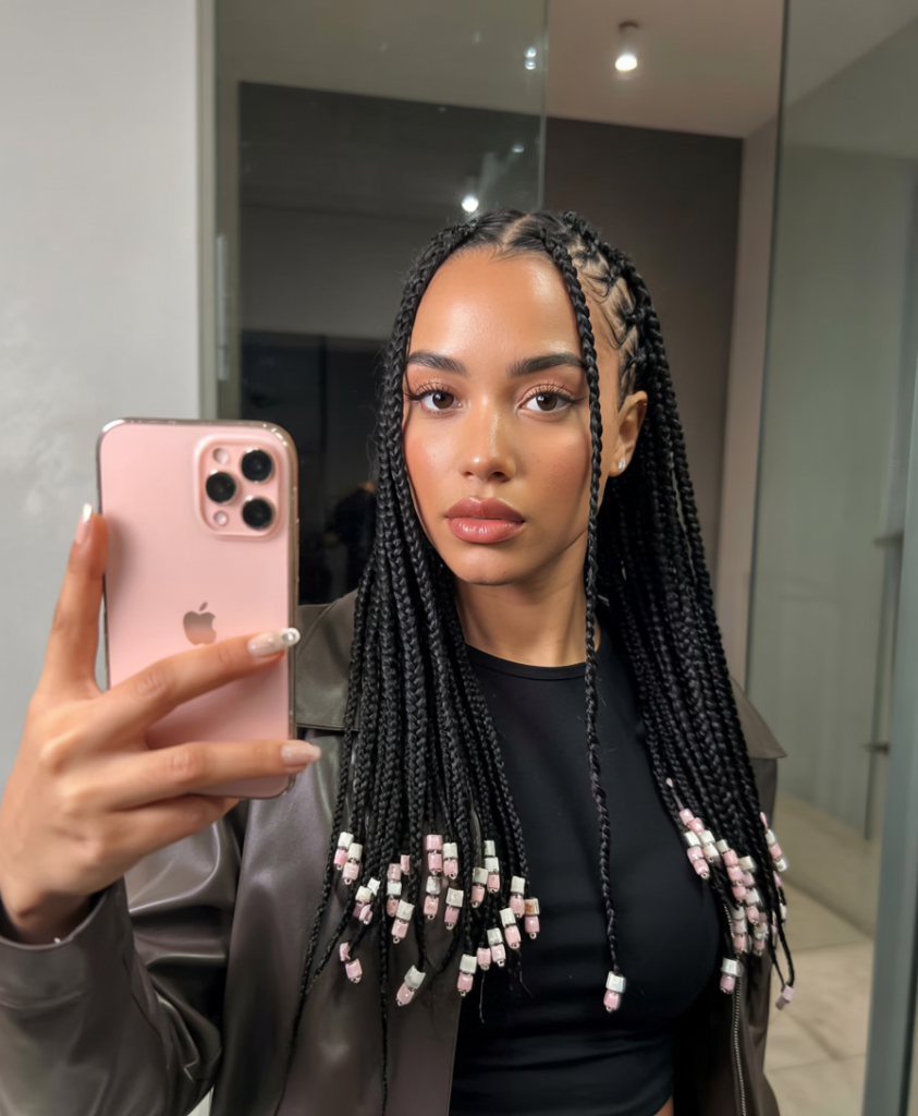This hairstyle suits black women who like it simple but effective best. The knotless design makes it lightweight and protective, and the length allows you to experiment with different outfit combinations and accessories. The vibe is cool – effortlessly; denim jackets, bold lip colours and an air of quiet confidence that never leaves unnoticed.