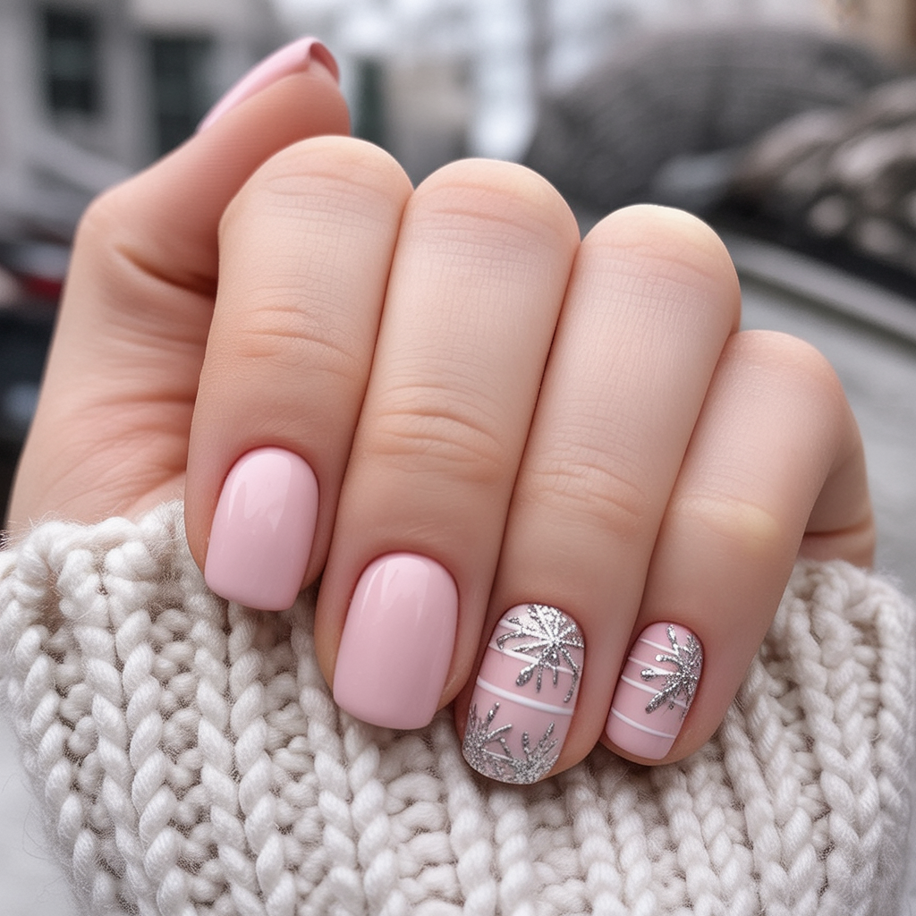Soft pink gel nails paired with silver glitter snowflake art bring a feminine and modern twist to winter styling. The blend of plain blush polish and glittery accents takes on a playful yet sophisticated vibe and can be worn on a day-to-day basis or on special occasions.