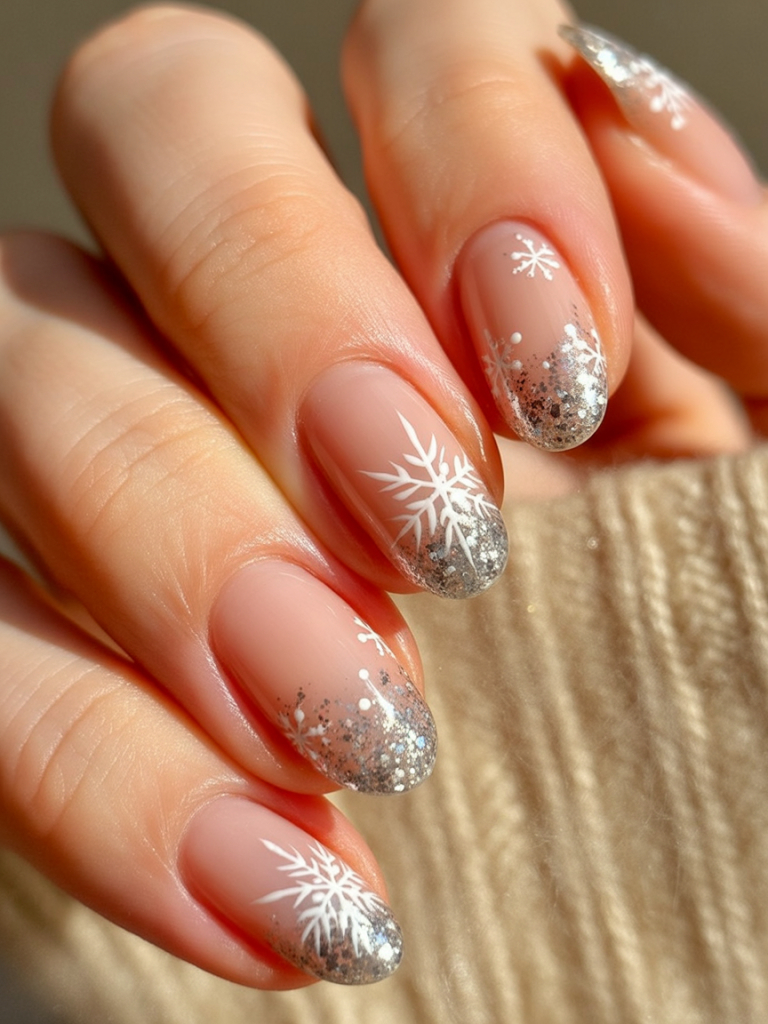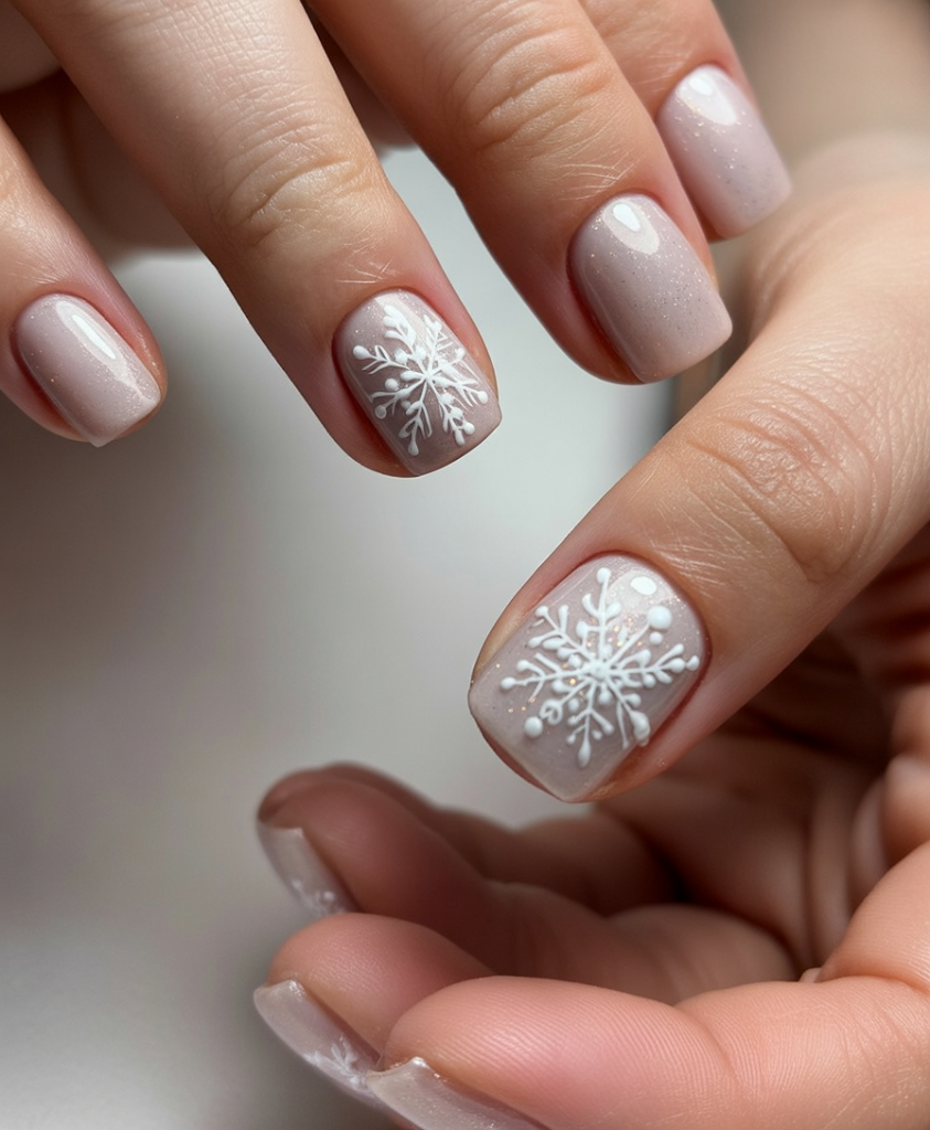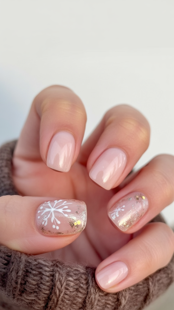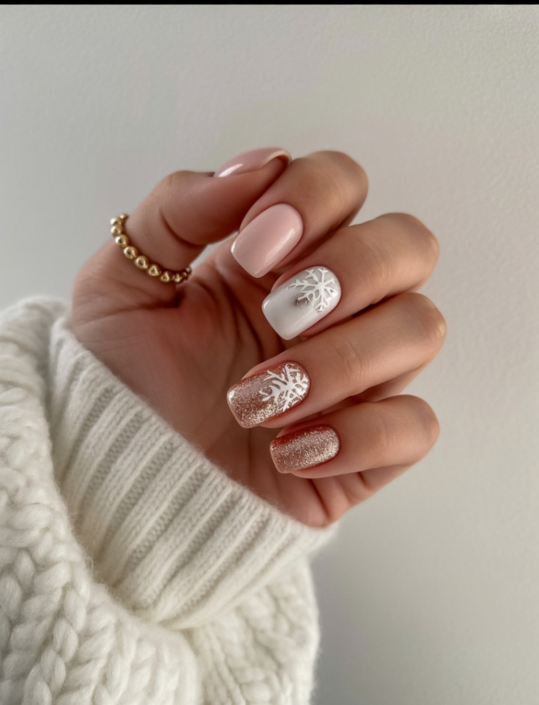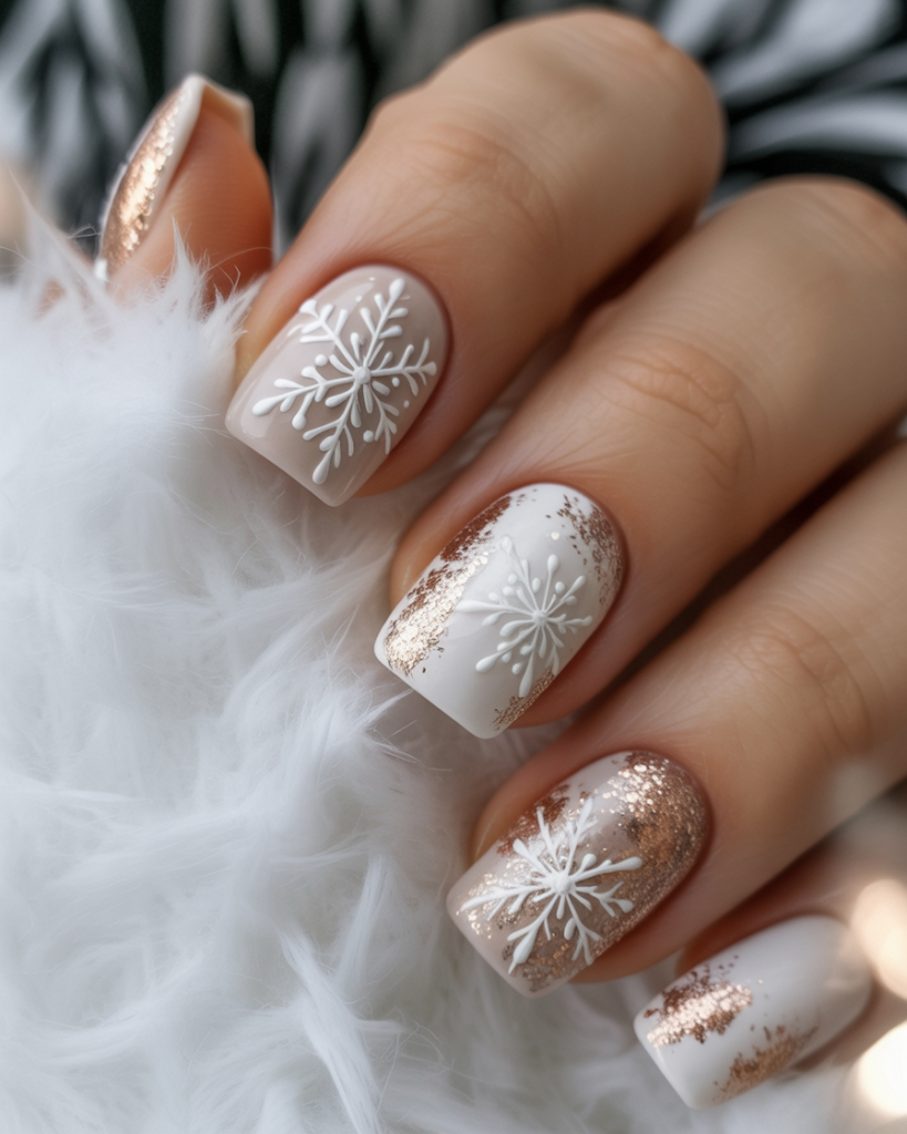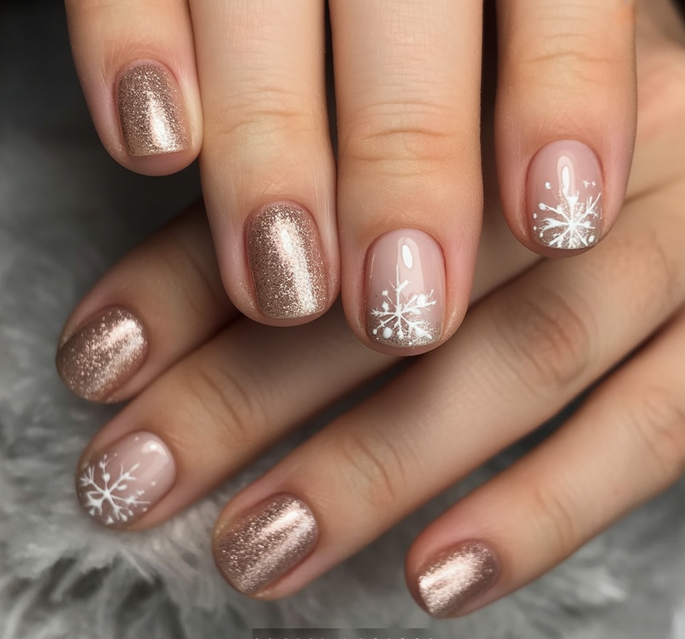 Snowflake Snowflake accents, nude bases, and rose gold glitters create a warm winter aesthetic glamorized impedimenta. Shimmer warm-festive, and the snowflakes inject a seasonal touch without any brashness. It discriminates between celebration and polish.