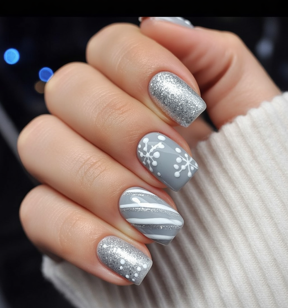 Soft grey Soft grey tones paired with silver glitter create a winter frost palette that feels modern and sleek. The accent art with snowberry-inspired dots and diagonal stripes adds playful details without compromising elegance. It’s festive yet not too busy-just perfect for the subtle razzle-dazzle preference.