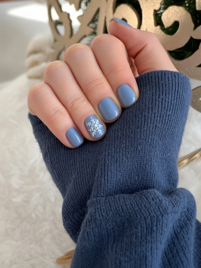 14. Dusty Blue Gel Nails with Snowflake Accent