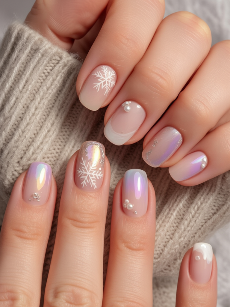 15. Iridescent Pearl and Snowflake Gel Nails