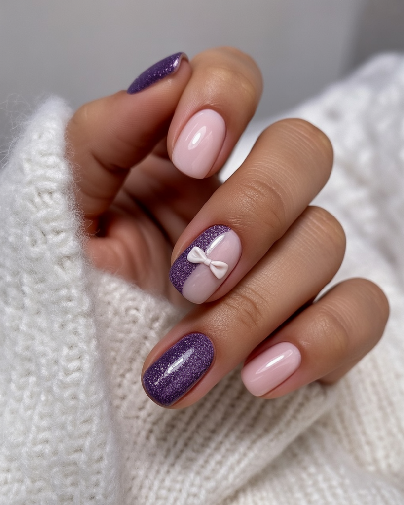 16. Bow Accent on Purple Glitter Gel Nails
