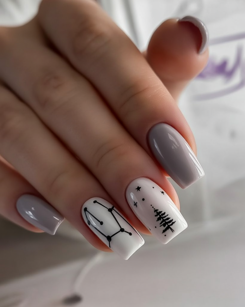 This design works wonderfully on square-shaped nails of medium length and is suitable for the kind of woman that prefers ideas with a story to them. If you are bored of the snowflake motif, this constellation type of design would be rather refreshing for winter 2026.