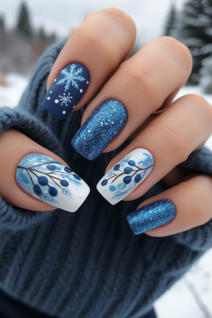 Deep navy, shimmering cobalt, and snowy white come together in this bold winter design. The snowflakes and berry branch accents make it feel like a scene straight out of a frosty forest. The glitter nails add that festive sparkle while the detailed art keeps it unique.