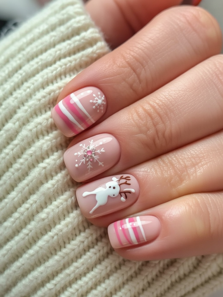 21. Pink Candy Stripe and Reindeer Gel Nails