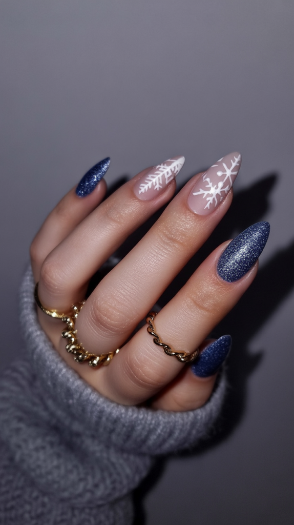 22. Navy Glitter And Snowflake Stiletto Gel Nails