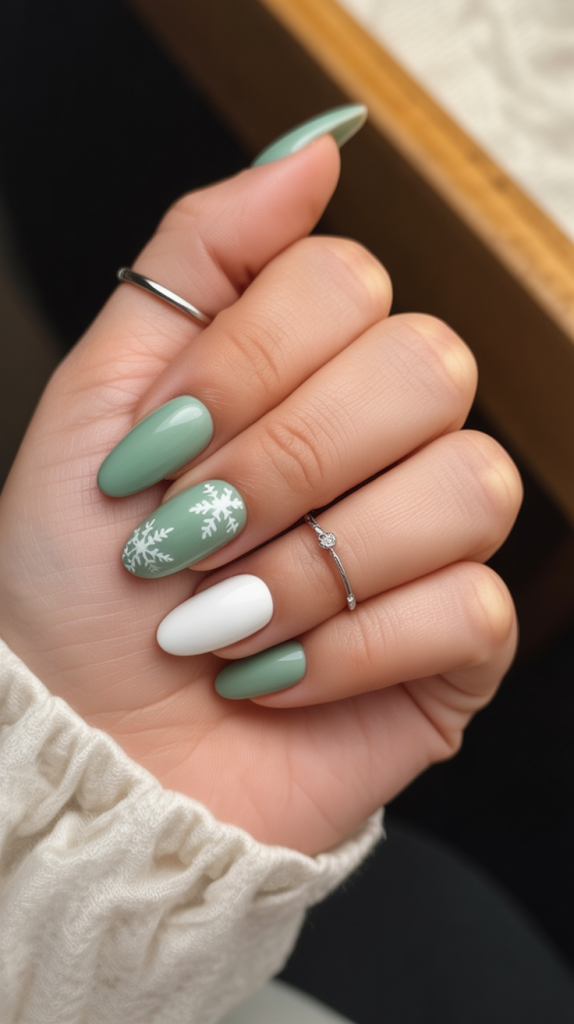 23. Sage Green and White Snowflake Gel Nails
