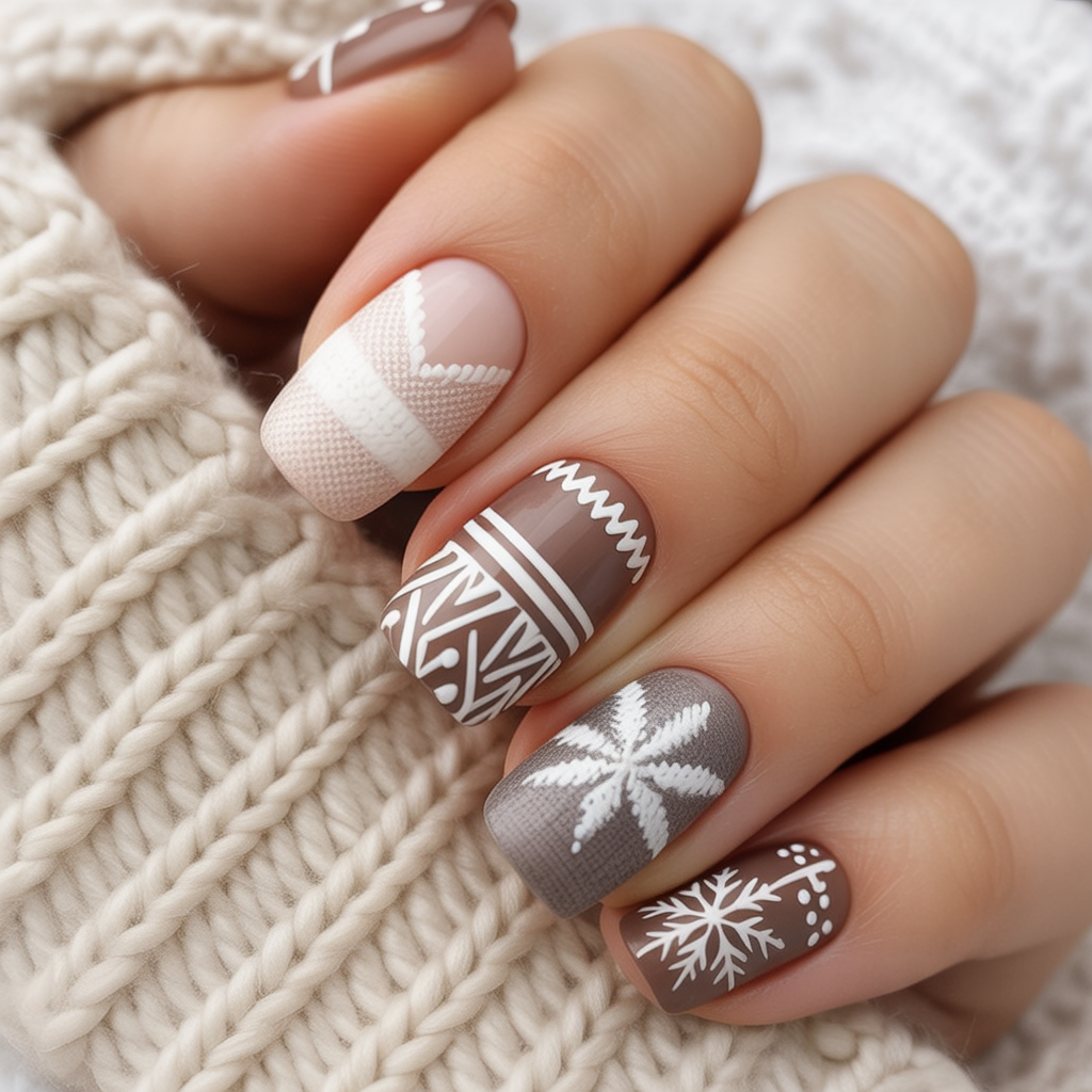 With With knit-like patterns and geometric shapes, this manicure channels the feel of a cozy winter sweater. The mix of nude and deep taupe bases with white details gives it an authentic Nordic vibe, making it perfect for cold-weather inspo.