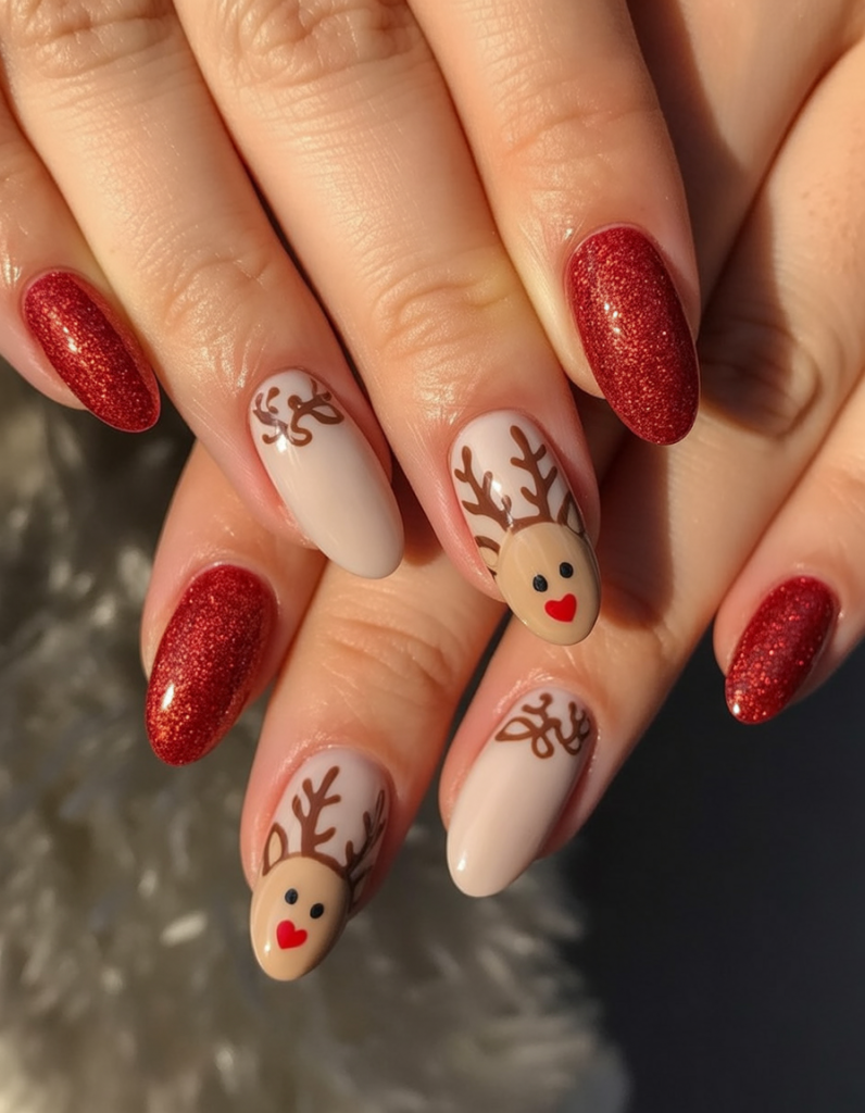 Nothing says Nothing sais festive quite like red glitter paired with adorable reindeer faces. This manicure feels joyful and fun, instantly putting you in the holiday mood. The mix of sparkling red and cute art keeps it playful while still looking polished.