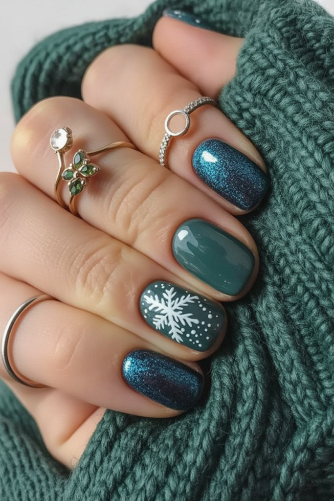 Dark teal and shimmering blue come together in this striking winter look, topped off with a delicate snowflake. The moody colors evoke starlit skies and frosted evergreens, bringing a unique twist to seasonal nail art. It’s bold without being overwhelming, perfect if you like standing out in subtle, classy ways.