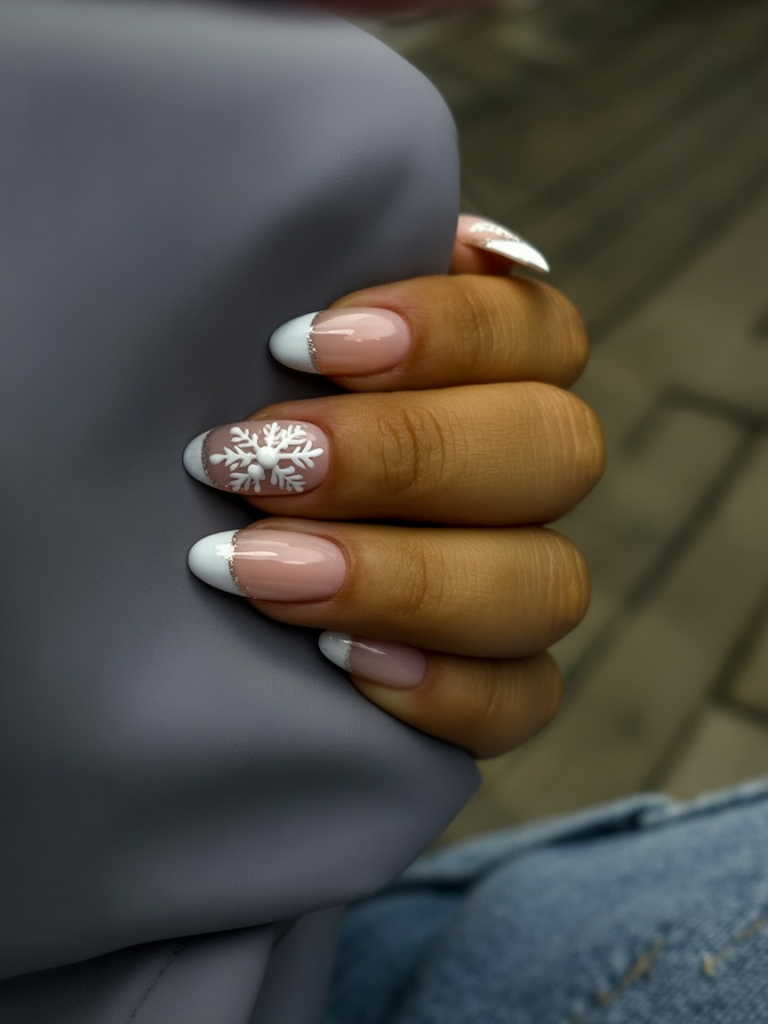 Classic French tips get a festive upgrade with an accent snowflake; by this, I mean playful yet elegant from an aura standpoint. It becomes sheer pink, white, and faint shimmer perfect for anyone who likes the simple designs struck with a seasonal touch. It’s beauty eternally with the perfect dash of holiday magic.