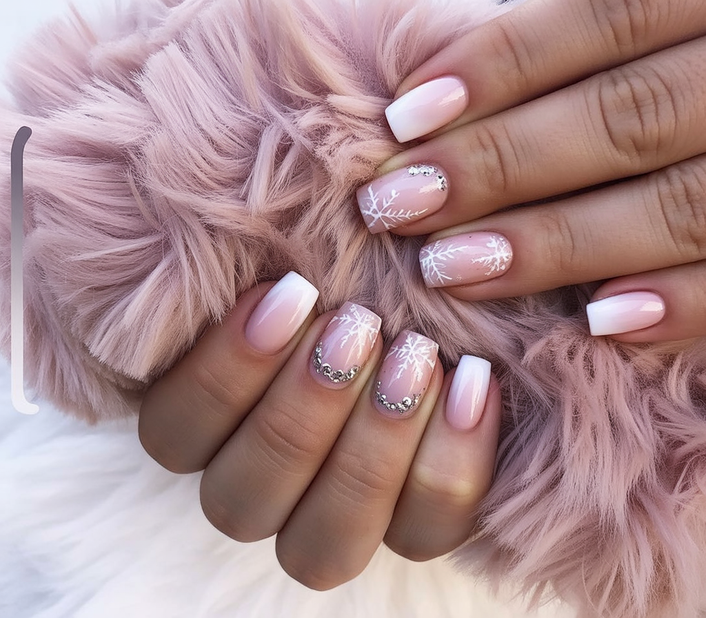 5. Pink Ombre Snowflake Gel Nails with Gems