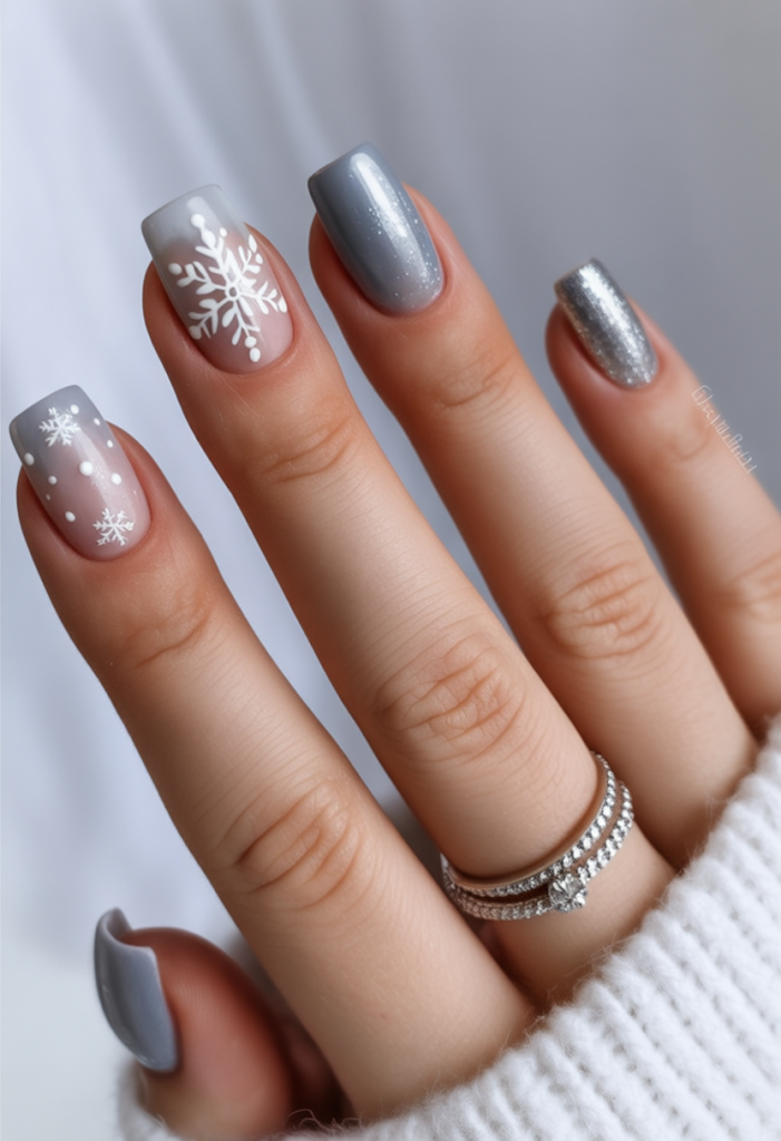 Cool grey tones paired with icy silver glitter give this manicure a frosted elegance. The snowflake accents look like delicate lace against a winter sky, creating a design that feels both chic and seasonally inspired. It’s the perfect mix of soft neutrals and shimmering details, making your nails the star of every gesture.