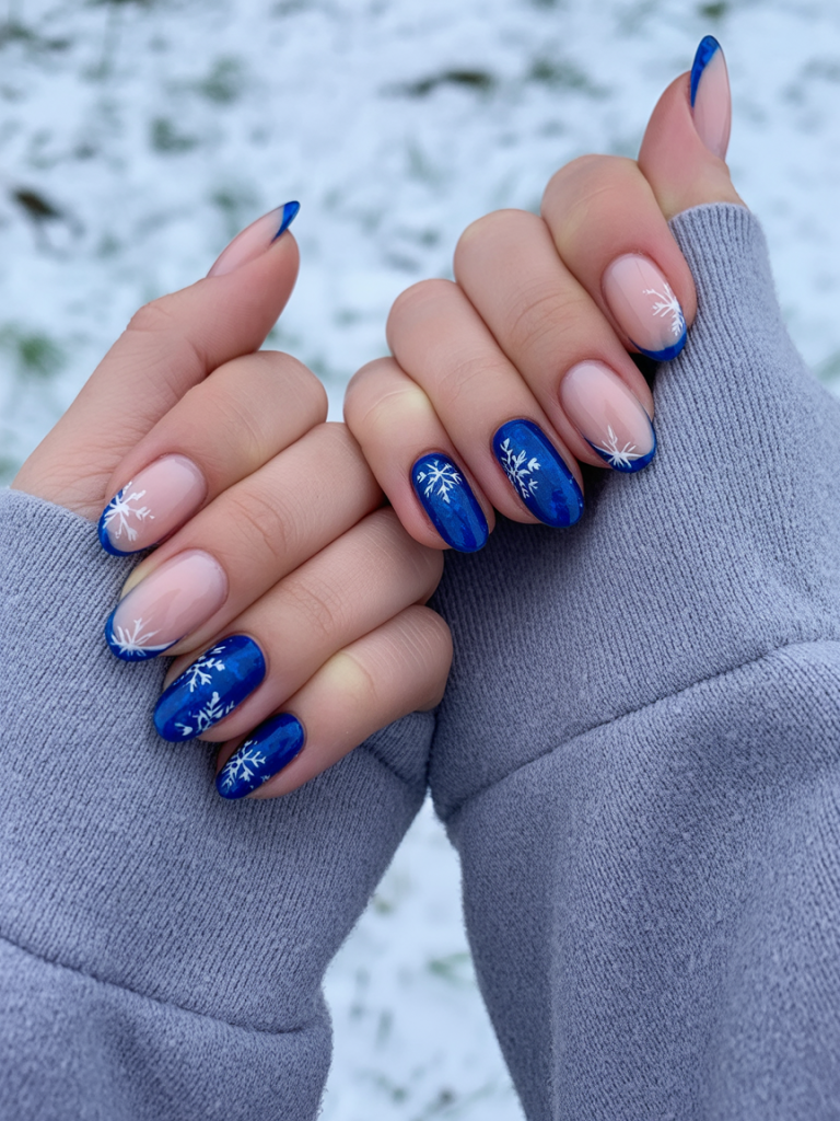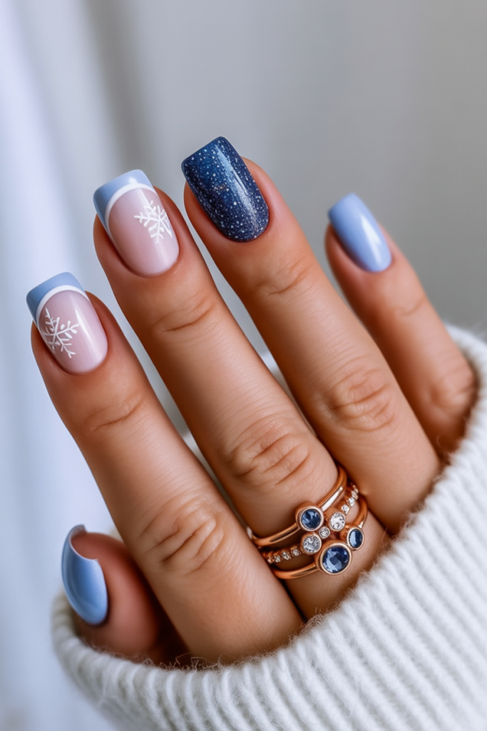 Soft pastel blue French tips meet a deep starry accent nail, finished with delicate snowflakes. The mix of sheer pink and cool tones makes this manicure feel playful yet classy. It’s like having both winter frost and midnight sparkle right at your fingertips.