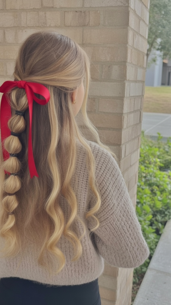 This hairstyle suits medium hair lengths and long hair, especially if you are looking for something easy to do with a bit of inspiration. It’s easy to do compared to other elaborate braiding styles and looks neat. The ribbon color adds dimension to the outfit and pairs well with neutral or festive attire, making it a versatile choice across various winter gatherings.