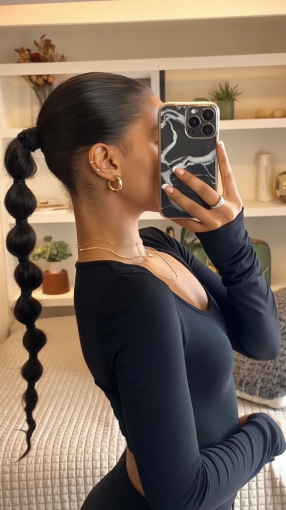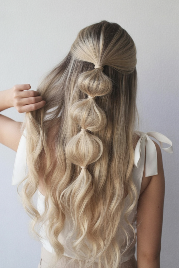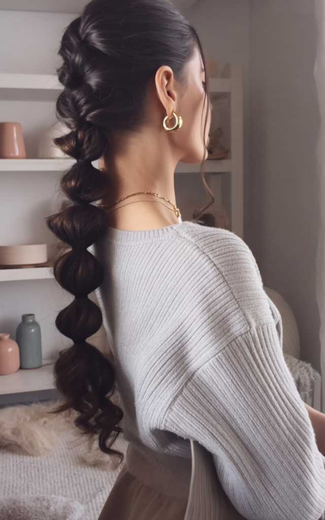 A bubble braid with extra volume looks both cute and chic, like a hairstyle from a winter fairytale. The round shapes make a statement, while the loose tendrils around the face keep it feminine and soft. The kind of look that feels at the same time cheerful and sophisticated, ideal for warm dinners or weekend getaways.