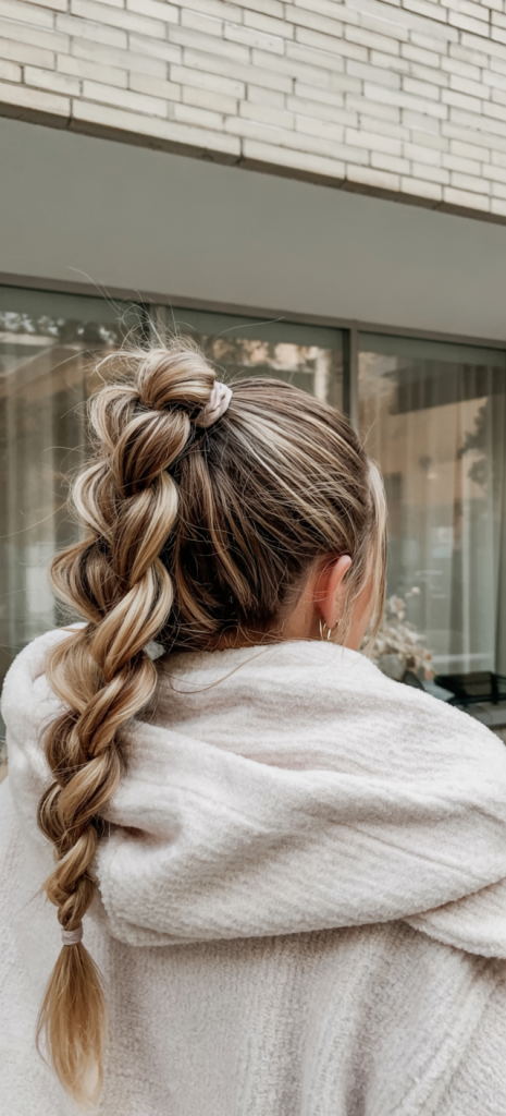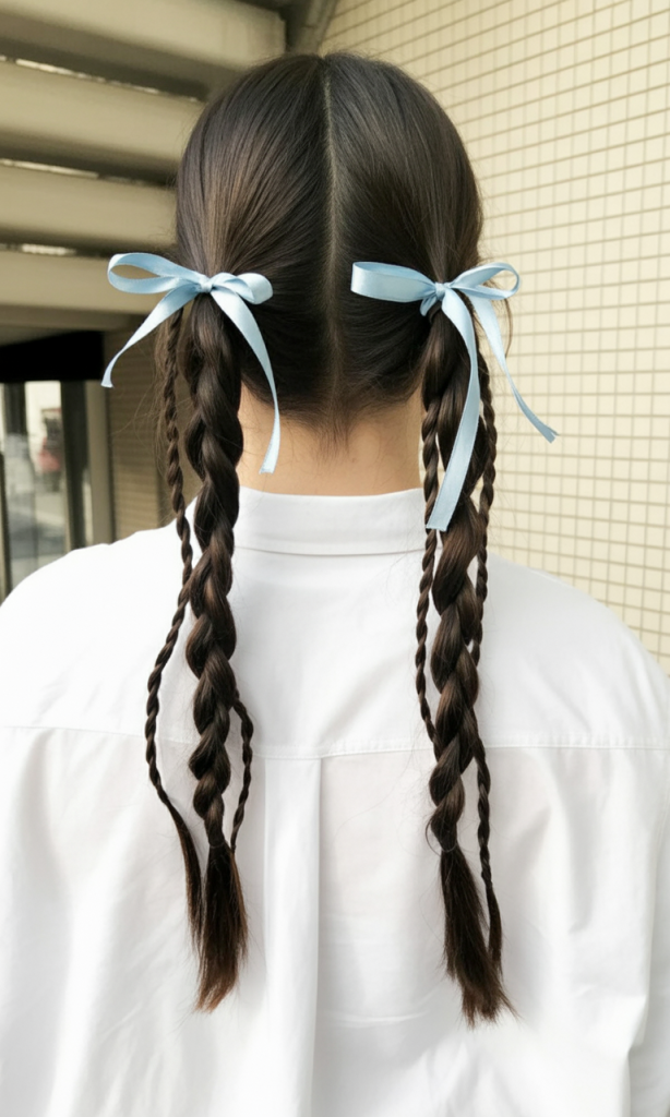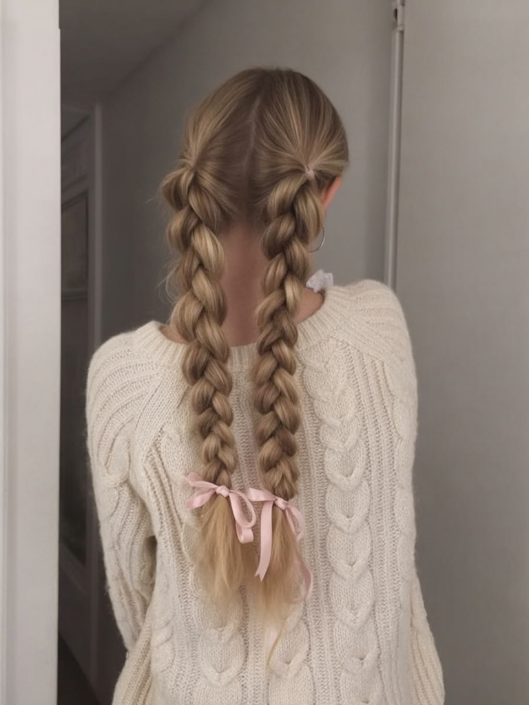 There is something so cute and nostalgic about double braids tied with pastel blue ribbons. It’s a playful winter style that feels comfortable and young, just right for days when you want to embrace something a little softer and more whimsical. The ribbons take a simple braid to another level of charming and memorable.