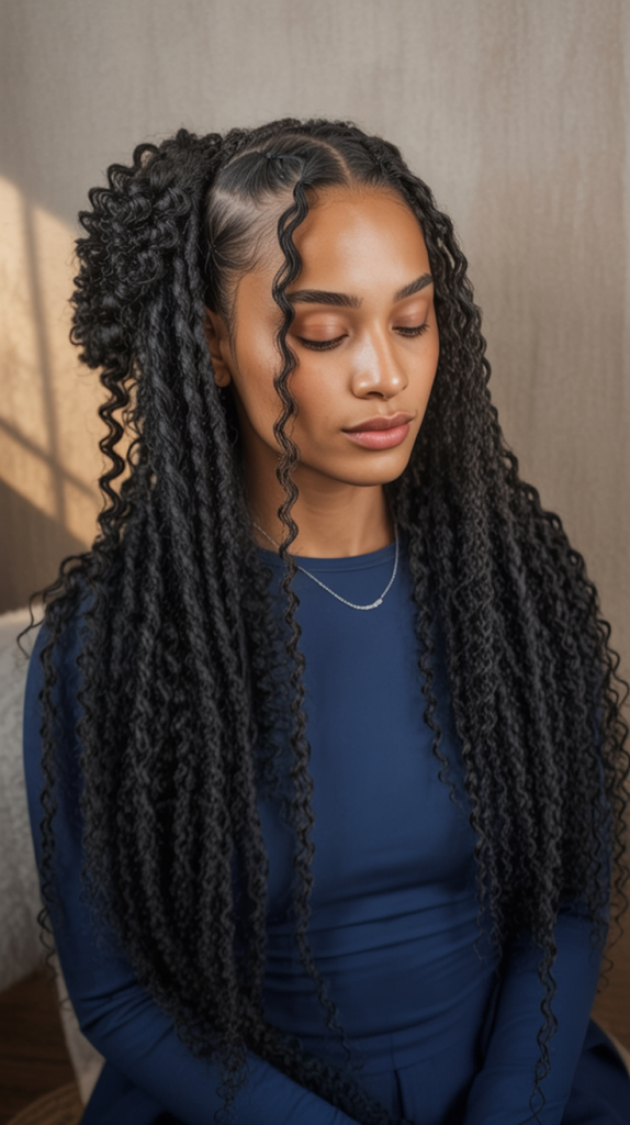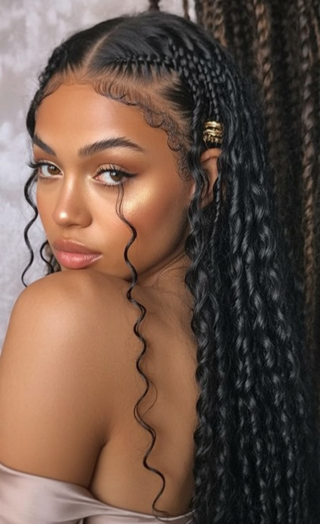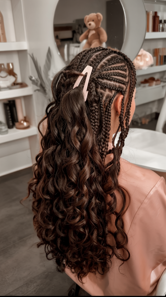 This hairstyle has the perfect balance between sleek and playful. The cornrows create structure and detail at the top while cascading curls add softness and bounce. The mix of the two creates a modern and cozy feeling, which is ideal for the winter season.