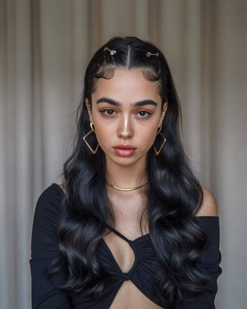 Long and sleek never go out of style, but add some delicate clips to a sharp center part and the whole vibe transforms into chic winter inspo. There’s a youthful and modern vibe here, tempered by the flowing hair that surrounds the face in the flatteringest way. This look is comfortable, but glamorous, when you could put on a coat and scarf and still look great.