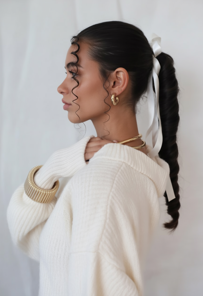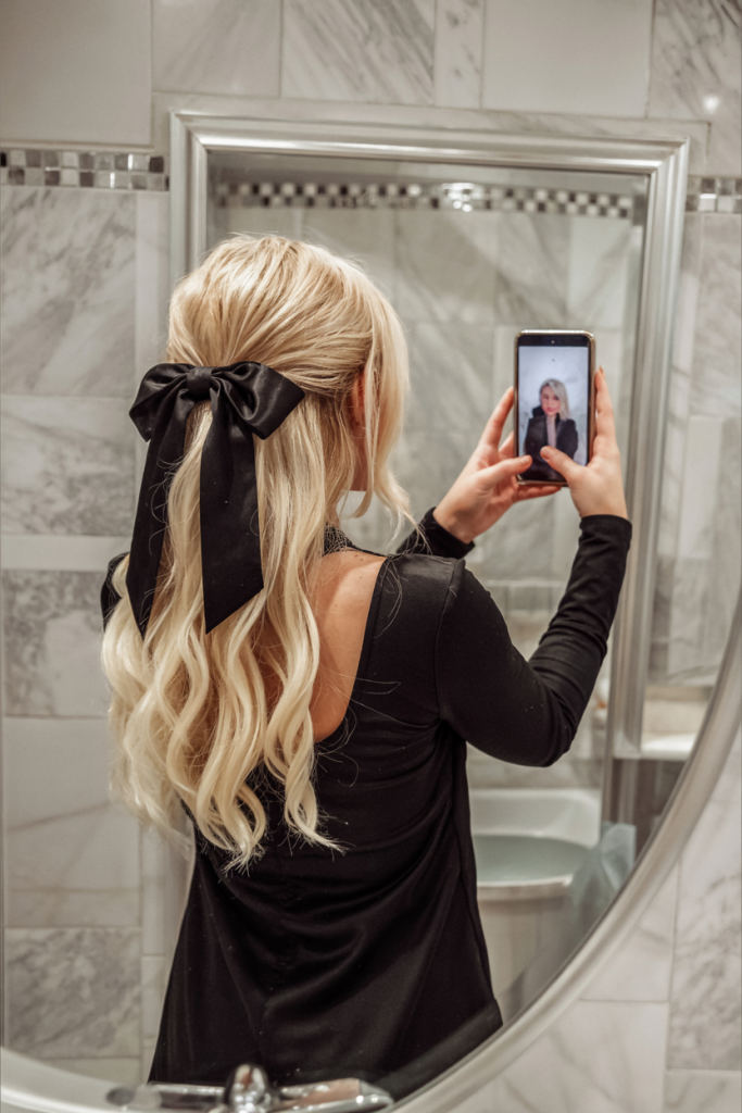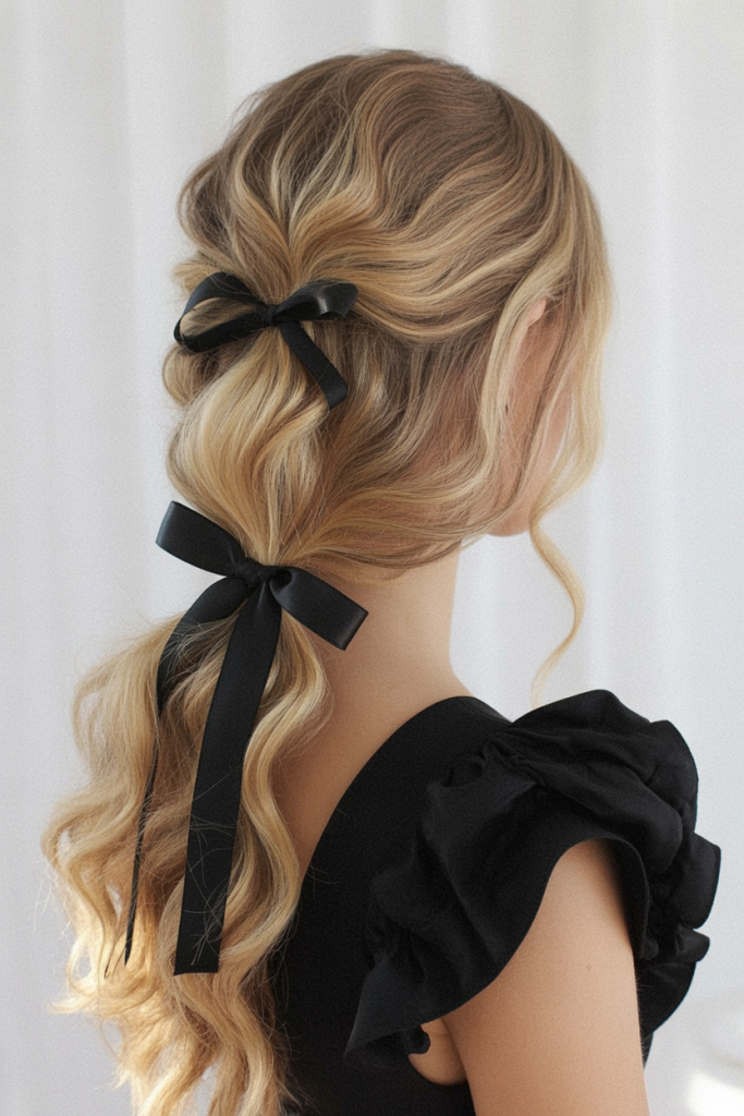 Tying your low ponytail with sleek black ribbons takes it to the next chic level. The layered waves make it look soft and elegant, yet playful – the balance we look for on winter days and evenings.