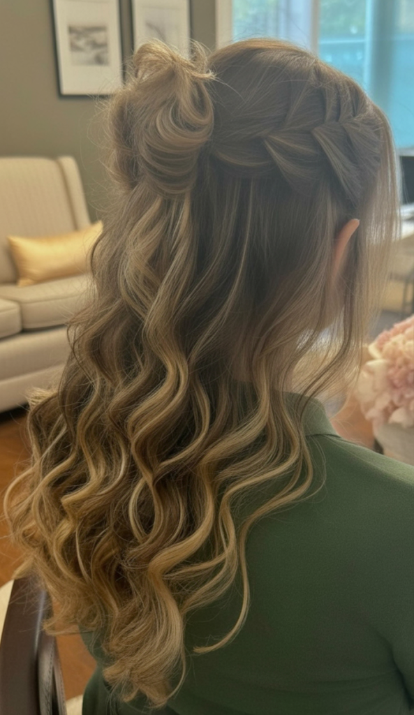 A low ponytail is elevated by a delicate braided crown and finished with a satin bow. This hairstyle is a perfect balance between romantic and practical, and it is ideal for winter events when you don’t want to overdo it with your hair. The gentle waves that flow from the ponytail create movement and a hint of comfortable glamour.