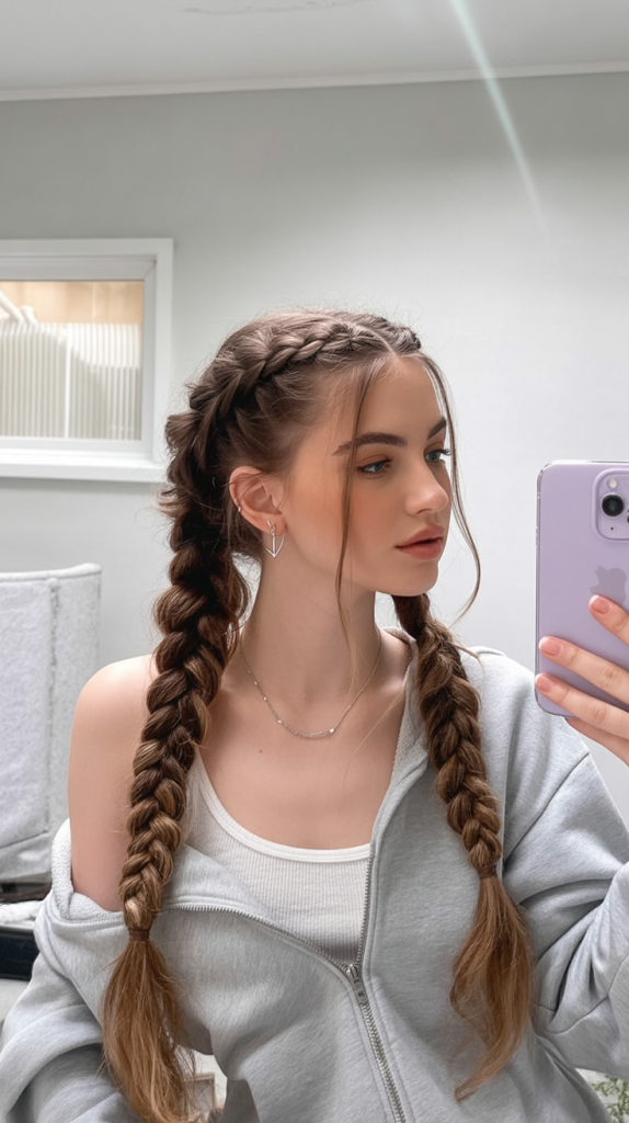 Twin Braids swept close to the scalp have that effortless French-girl vibe – relaxed and yet impossibly chic. The way they use a few strands around the face gives the impression of this hairstyle being very casual and cozy, like it was just made to be used under a warm cap on snowy days or in combination with a soft coat for winter walks in the city.