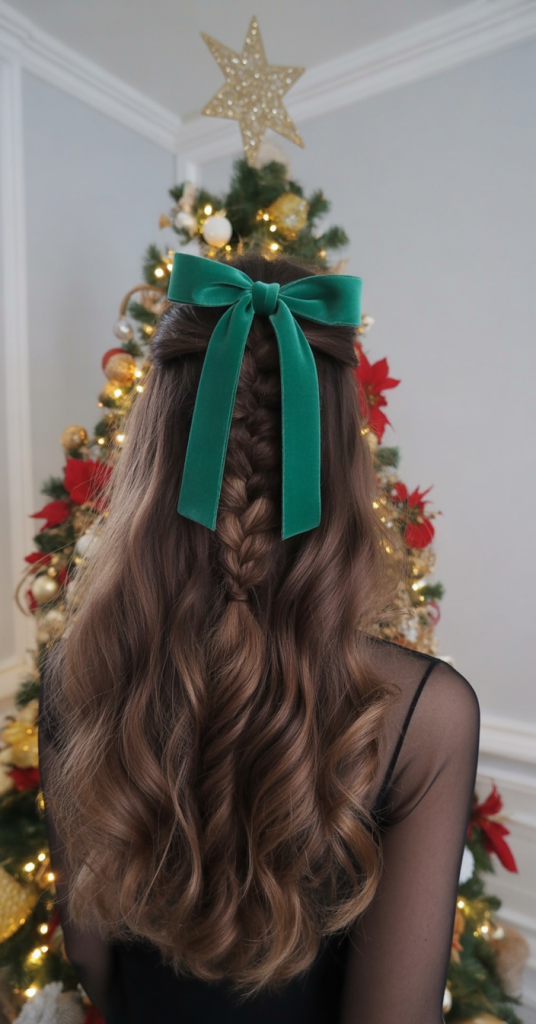 Few things say winter style quite like a velvet bow, especially in jewel tones. This half-up braid with a rich green ribbon is both chic and festive without needing to be over the top. The cascading curls below lend it a sense of motion and softness, making it an easy way to add holiday flair to your hairstyle.
