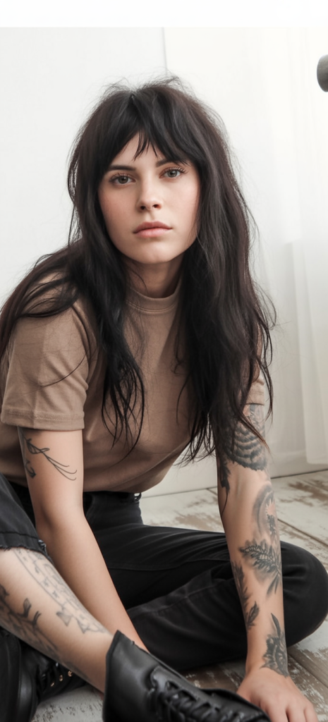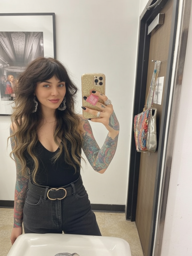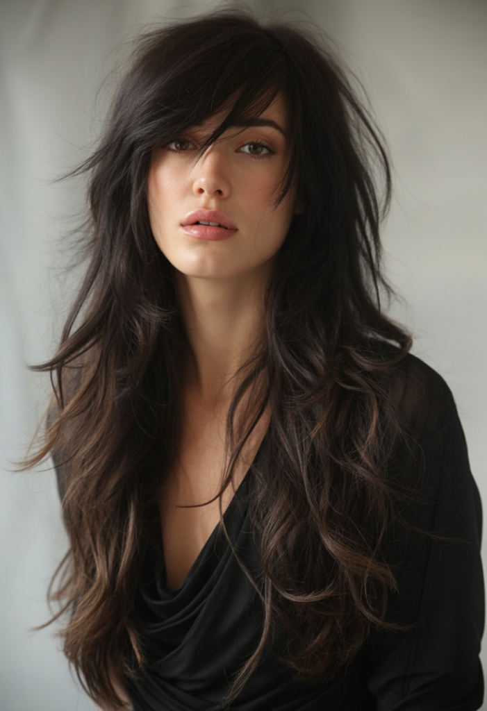 There’s something effortlessly enchanting about this tousled, undone style. It goes on about walks in the forest in dusk, rituals of barefoot, and the soul that does not obey the rules. The chunky fringe combined with those long, loose waves is a bit rebellious, but in the most alluring way, the kind of the enchantress of today who knows what she wants (and takes it).